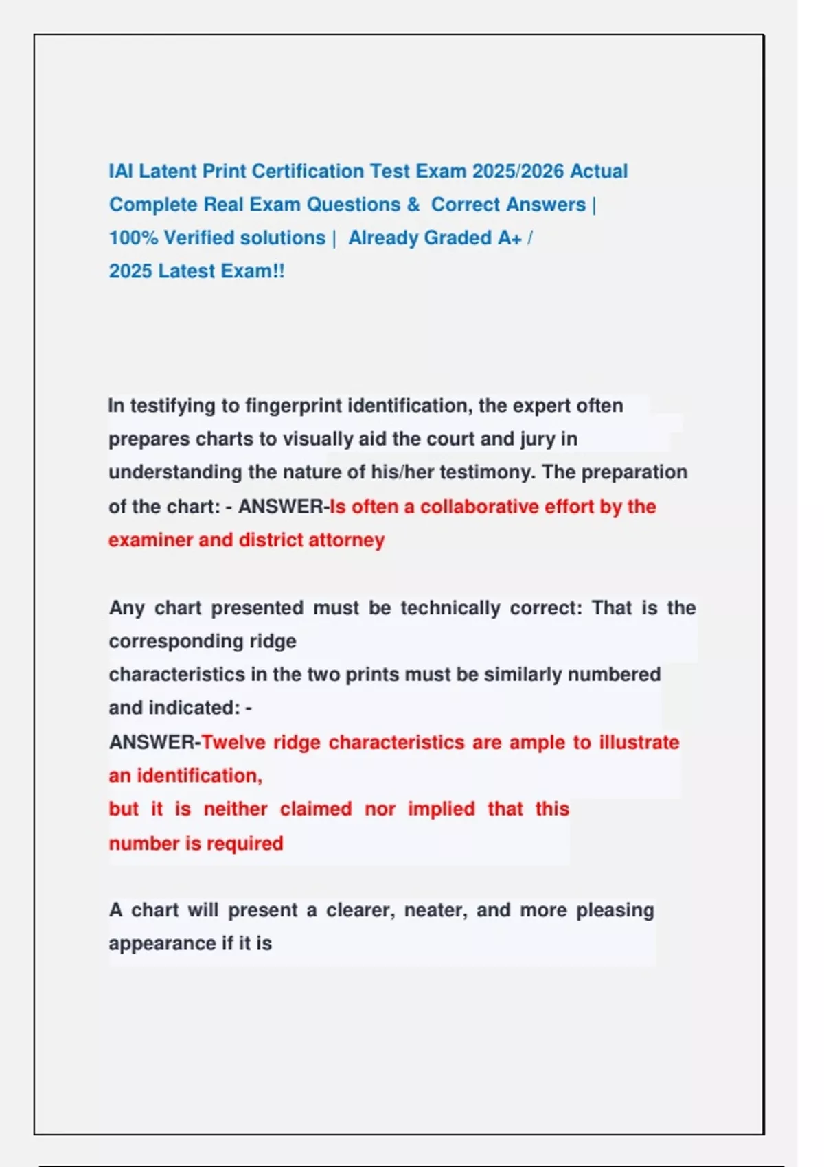 IAI Latent Print Certification Test Exam 2025/2026 Actual Complete Real Exam Questions & Correct Answers | 100% Verified solutions | Already Graded A+ / 2025 Latest Exam!! IAI Latent Print Certification Test Exam 2025/2026 Actual Complete Real Exam Questions & Correct Answers | 100% Verified solutions | Already Graded A+ / 2025 Latest Exam!! IAI Latent Print Certification Test Exam 2025/2026 Actual Complete Real Exam Questions & Correct Answers | 100% Verified solutions | Already Graded A+ / 2025 Latest Exam!! IAI Latent Print Certification Test Exam 2025/2026 Actual Complete Real Exam Questions & Correct Answers | 100% Verified solutions | Already Graded A+ / 2025 Latest Exam!! IAI Latent Print Certification Test Exam 2025/2026 Actual Complete Real Exam Questions & Correct Answers | 100% Verified solutions | Already Graded A+ / 2025 Latest Exam!! IAI Latent Print Certification Test Exam 2025/2026 Actual Complete Real Exam Questions & Correct Answers | 100% Verified solutions | Already Graded A+ / 2025 Latest Exam!! IAI Latent Print Certification Test Exam 2025/2026 Actual Complete Real Exam Questions & Correct Answers | 100% Verified solutions | Already Graded A+ / 2025 Latest Exam!!