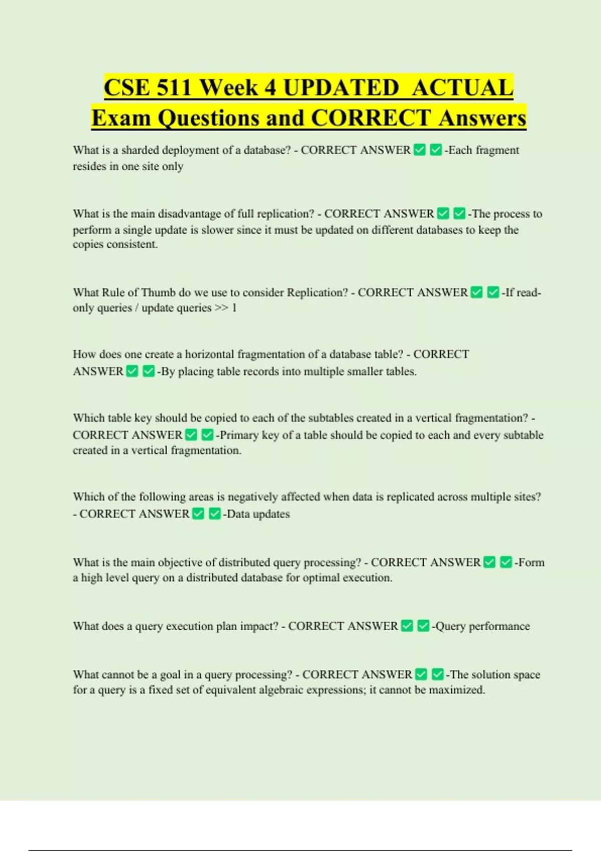 CSE 511 Week 4 UPDATED ACTUAL Exam Questions and CORRECT Answers What is a sharded deployment of a database? - CORRECT ANSWER resides in one site only What is the main disadvantage of full replication? - CORRECT ANSWER -Each fragment -The process to perform a single update is slower since it must be updated on different databases to keep the copies consistent.