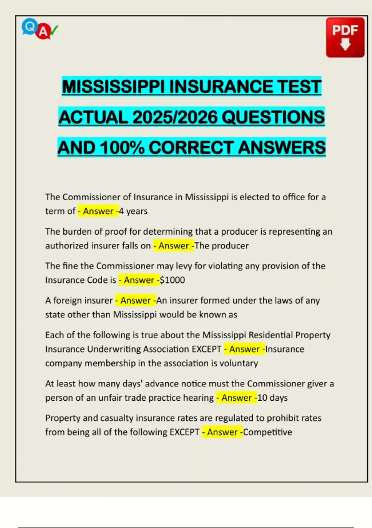 MISSISSIPPI INSURANCE TEST ACTUAL 2025/2026 QUESTIONS AND 100% CORRECT ANSWERS The Commissioner of Insurance in Mississippi is elected to office for a term of - Answer -4 years The burden of proof for determining that a producer is representing an authorized insurer falls on - Answer -The producer The fine the Commissioner may levy for violating any provision of the Insurance Code is - Answer -$1000 A foreign insurer - Answer -An insurer formed under the laws of any state other than Mississippi would be known as Each of the following is true about the Mississippi Residential Property Insurance Underwriting Association EXCEPT - Answer -Insurance company membership in the association is voluntary At least how many days' a