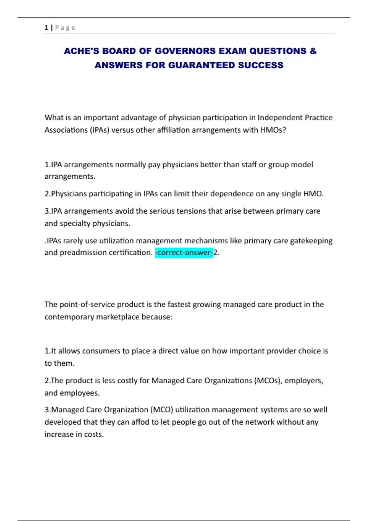 ACHE'S BOARD OF GOVERNORS EXAM QUESTIONS &