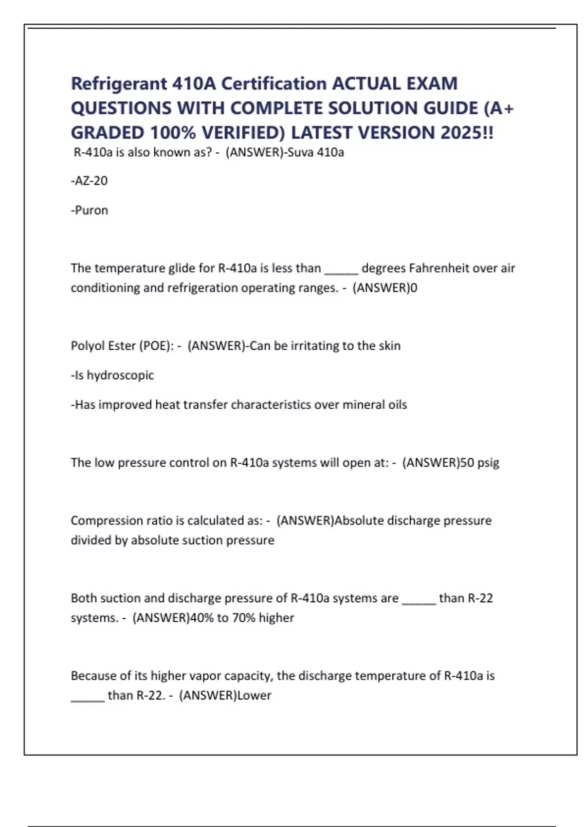 Refrigerant 410A Certification ACTUAL EXAM QUESTIONS WITH COMPLETE SOLUTION GUIDE (A+ GRADED 100% VERIFIED) LATEST VERSION 2025!!