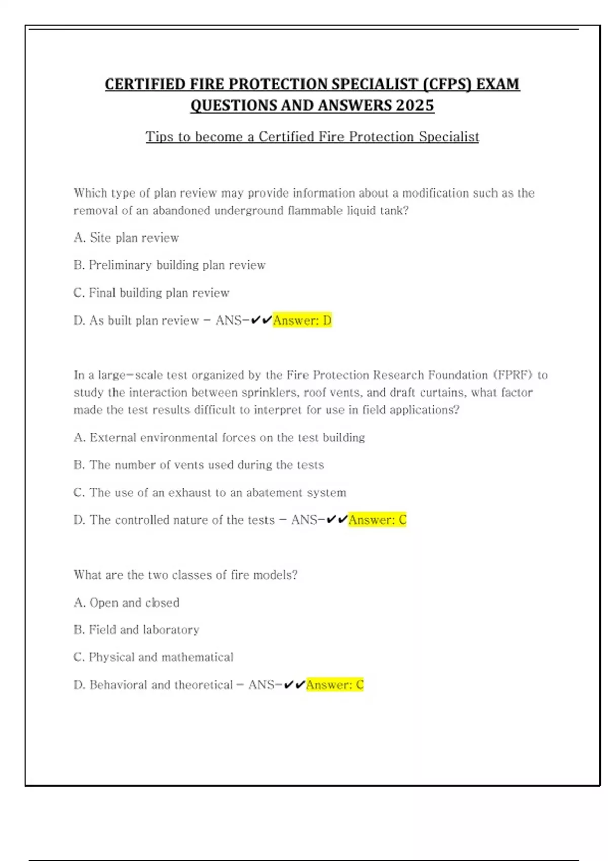 CERTIFIED FIRE PROTECTION SPECIALIST (CFPS) EXAM QUESTIONS AND ANSWERS 2025 Tips to become a Certified Fire Protection Specialist Which type of plan review may provide information about a modification such as the removal of an abandoned underground flammable liquid tank? A. Site plan review B. Preliminary building plan review C. Final building plan review D. As built plan review - ANS-Answer: D In a large-scale test organized by the Fire Protection Research Foundation (FPRF) to study the interaction between sprinklers, roof vents, and draft curtains, what factor made the test results difficult to interpret for use in field applications? A. External environmental forces on the test building B. The number of vents used during the tests C. The use of an exhaust to an abatement system D. The controlled nature of the tests - ANS-Answer: C What are the two classes of fire models? A. Open and closed B. Field and laboratory C. Physical and mathematical D. Behavioral and theoretical - ANS-Answer: C Which type of fire alarm system transmits signals that are permanently recorded at a constantly attended supervising station located either at the protected premises or at another location of the property owner? CONTINUES...