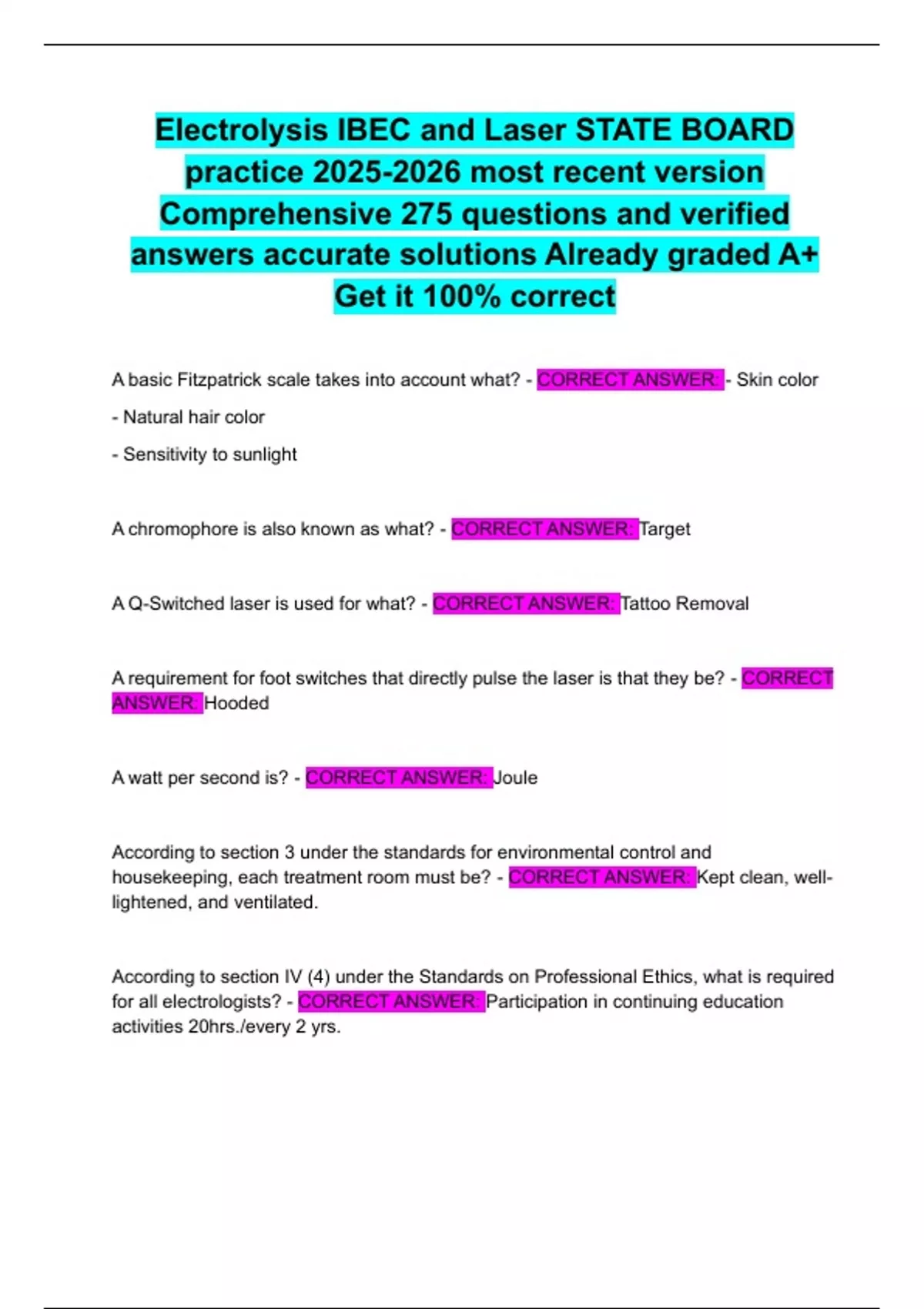 Electrolysis IBEC and Laser STATE BOARD practice most recent version Comprehensive 275 questions and verified answers accurate solutions Already graded A+ Get it 100% correct