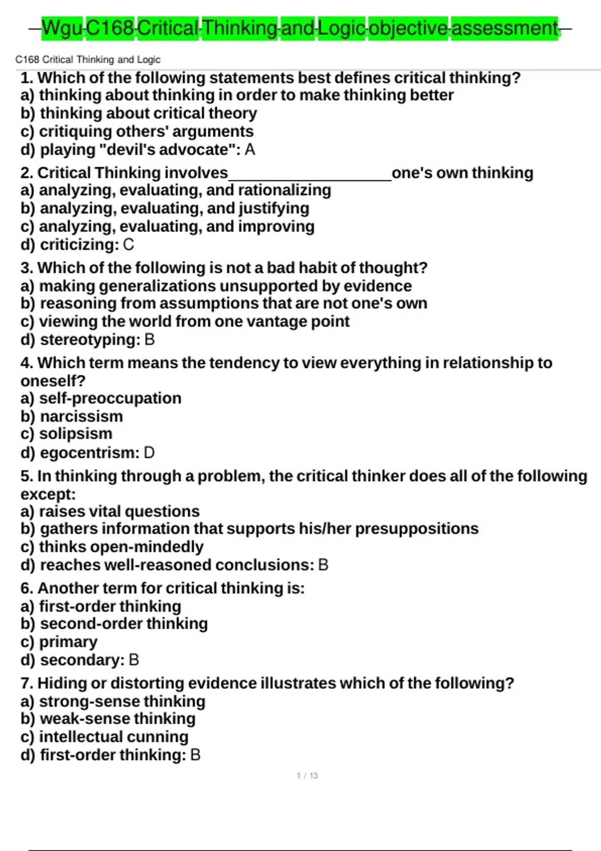 Wgu C168 Critical Thinking and Logic objective assessment.