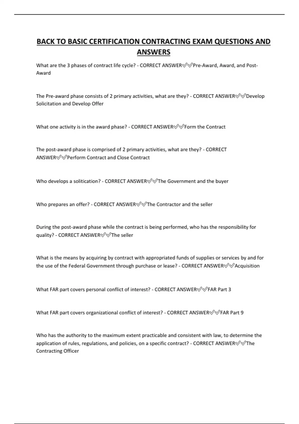 BACK TO BASIC CERTIFICATION CONTRACTING EXAM QUESTIONS AND ANSWERS.