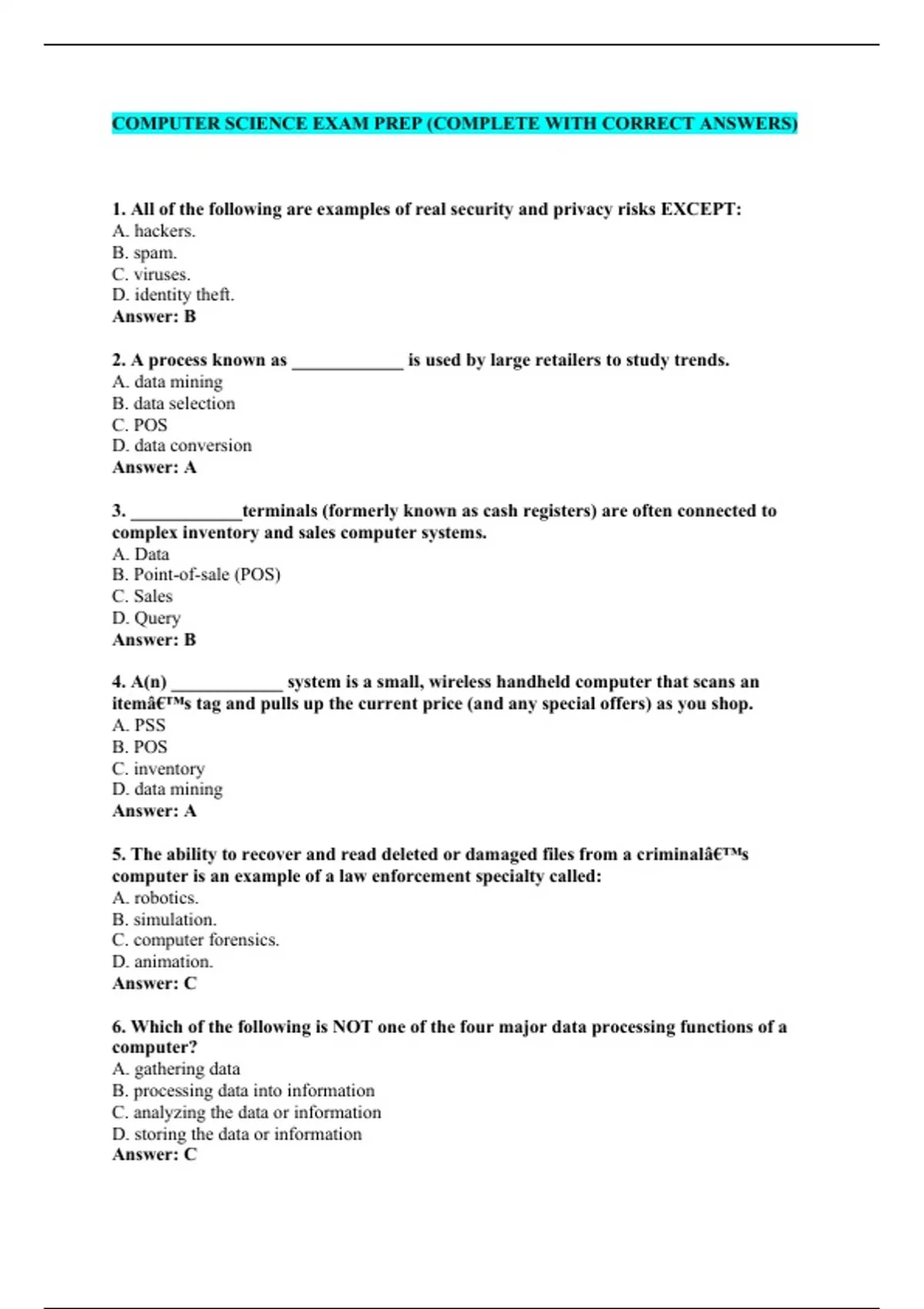 COMPUTER SCIENCE EXAM PREP (COMPLETE WITH CORRECT ANSWERS)