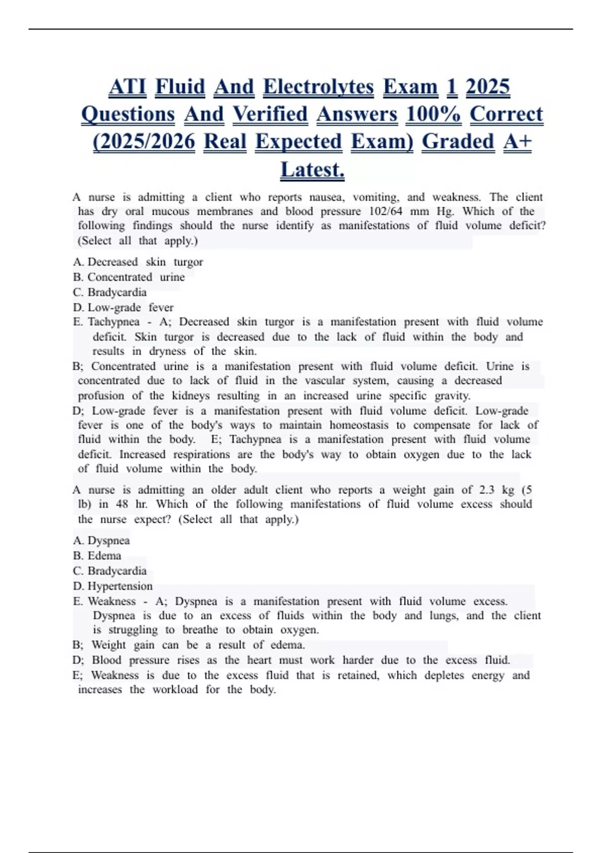 ATI Fluid And Electrolytes Exam 1 2025 Questions And Verified Answers 100% Correct (2025/2026 Real Expected Exam) Graded A+ Latest. ATI Fluid And Electrolytes Exam 1 2025 Questions And Verified Answers 100% Correct (2025/2026 Real Expected Exam) Graded A+ Latest. ATI Fluid And Electrolytes Exam 1 2025 Questions And Verified Answers 100% Correct (2025/2026 Real Expected Exam) Graded A+ Latest. ATI Fluid And Electrolytes Exam 1 2025 Questions And Verified Answers 100% Correct (2025/2026 Real Expected Exam) Graded A+ Latest. ATI Fluid And Electrolytes Exam 1 2025 Questions And Verified Answers 100% Correct (2025/2026 Real Expected Exam) Graded A+ Latest.