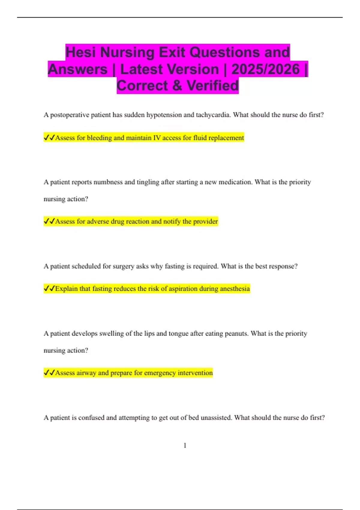 Hesi Nursing Exit Questions and Answers | Latest Version | 2025/2026 | Correct & Verified A postoperative patient has sudden hypotension and tachycardia. What should the nurse do first? Assess for bleeding and maintain IV access for fluid replacement A patient reports numbness and tingling after starting a new medication. What is the priority nursing action? Assess for adverse drug reaction and notify the provider A patient scheduled for surgery asks why fasting is required. What is the best response? Explain that fasting reduces the risk of aspiration during anesthesia A patient develops swelling of the lips and tongue after eating peanuts. What is the priority nursing action? Assess airway and prepare for emergency intervention A patient is confused and attempting to get out of bed unassisted. What should the nurse do first? 2 Implement fall precautions and provide close supervision A patient reports chest pain radiating to the jaw. What is the first action? Assess vital signs and apply cardiac monitoring immediately A patient refuses a newly prescribed medication. How should the nurse respond? Explain the purpose, benefits, and potential risks of the medication A patient with COPD reports worsening shortness of breath. What should the nurse do first? Administer prescribed oxygen and assess respiratory effort A child presents with high fever and seizure activity. What is the nurse’s first action? Ensure safety, maintain airway, and monitor seizure activity A postoperative patient reports severe pain not relieved by medication. What is the priority nursing action? Assess for complications such as infection, bleeding, or surgical site issues 3 A patient has a Foley catheter and reports bladder discomfort. What should the nurse do first? Check for kinks, ensure patency, and assess for infection A patient reports persistent nausea after chemotherapy. What is the first nursing action? Assess severity and administer antiemetic as prescribed A patient with diabetes has a blood glucose of 38 mg/dL and is lethargic. What is the priority nursing action? Administer a rapid-acting carbohydrate A patient reports dizziness and fainting. What should the nurse do first? Place the patient supine, assess vital signs, and monitor closely A patient develops a sudden severe headache and vision changes. What is the first nursing action? Notify the provider immediately and monitor neurological status 4 A postoperative patient reports shortness of breath and low oxygen saturation. What is the priority action? Administer oxygen, assess airway, and monitor vital signs A patient reports black, tarry stools while taking anticoagulants. What should the nurse do first? Notify the provider immediately and hold the medication A patient is scheduled for blood transfusion and has a history of reaction. What is the first step? Verify patient history and ensure appropriate pre-medication is administered A patient reports numbness in lower extremities.