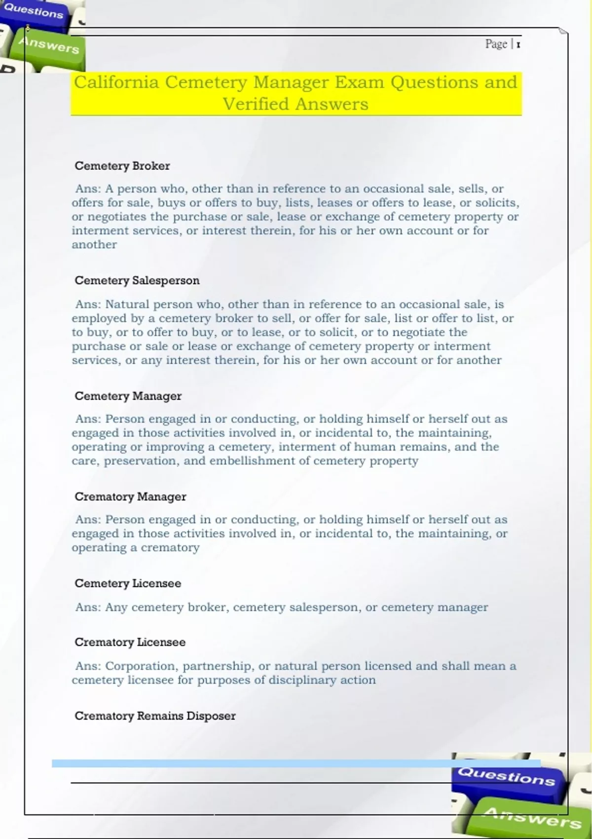Cemetery Broker Ans: A person who, other than in reference to an occasional sale, sells, or offers for sale, buys or offers to buy, lists, leases or offers to lease, or solicits, or negotiates the purchase or sale, lease or exchange of cemetery property or interment services, or interest therein, for his or her own account or for another Cemetery Salesperson Ans: Natural person who, other than in reference to an occasional sale, is employed by a cemetery broker to sell, or offer for sale, list or offer to list, or to buy, or to offer to buy, or to lease, or to solicit, or to negotiate the purchase or sale or lease or exchange of cemetery property or interment services, or any interest therein, for his or her own account or for another Cemetery Manager Crematory Manager Ans: Person engaged in or conducting, or holding himself or herself out as engaged in those activities involved in, or incidental to, the maintaining, operating or improving a cemetery, interment of human remains, and the care, preservation, and embellishment of cemetery property Ans: Person engaged in or conducting, or holding himself or herself out as engaged in those activities involved in, or incidental to, the maintaining, or operating a crematory Cemetery Licensee Ans: Any cemetery broker, cemetery salesperson, or cemetery manager Crematory Licensee Ans: Corporation, partnership, or natural person licensed and shall mean a cemetery licensee for purpo