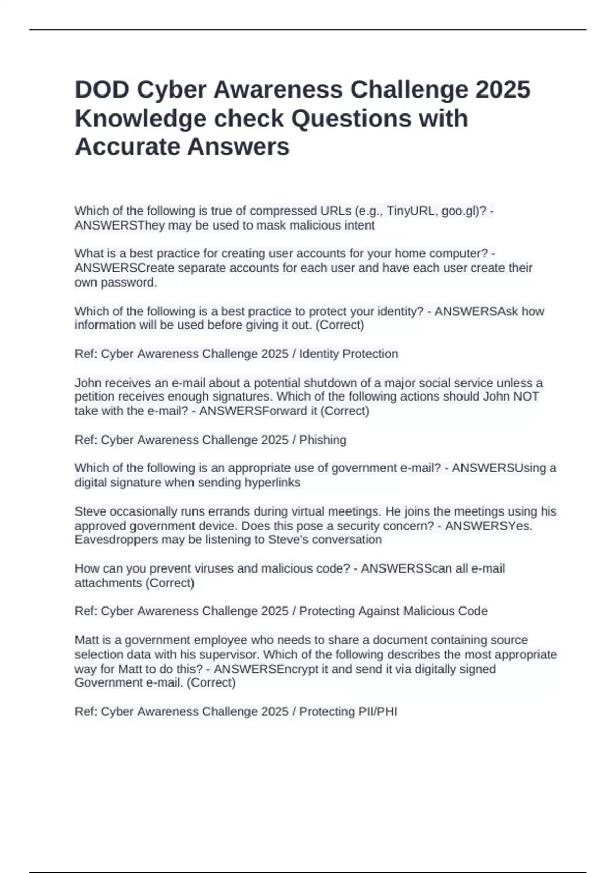 Which of the following is true of compressed URLs (e.g., TinyURL, )? - ANSWERSThey may be used to mask malicious intent What is a best practice for creating user accounts for your home computer? - ANSWERSCreate separate accounts for each user and have each user create their own password. Which of the following is a best practice to protect your identity? - ANSWERSAsk how information will be used before giving it out. (Correct) Ref: Cyber Awareness Challenge 2025 / Identity Protection John receives an e-mail about a potential shutdown of a major social service unless a petition receives enough signatures. Which of the following actions should John NOT take with the e-mail? - ANSWERSForward it (Correct) Ref: Cyber Awareness Challenge 2025 / Phishing Which of the following is an appropriate use of government e-mail? - ANSWERSUsing a digital signature when sending hyperlinks Steve occasionally runs errands during virtual meetings. He joins the meetings using his approved government device. Does this pose a security concern? - ANSWERSYes. Eavesdroppers may be listening to Steve's conversation How can you prevent viruses and malicious code? - ANSWERSScan all e-mail attachments (Correct) Ref: Cyber Awareness Challenge 2025 / Protecting Against Malicious Code Matt is a government employee who needs to share a document containing source selection data with his supervisor. Which of the following describes the most appropriate way for Matt to do this? - ANSWERSEncrypt it and send it via digitally signed Government e-mail. (Correct) Ref: Cyber Awareness Challenge 2025 / Protecting PII/PHI