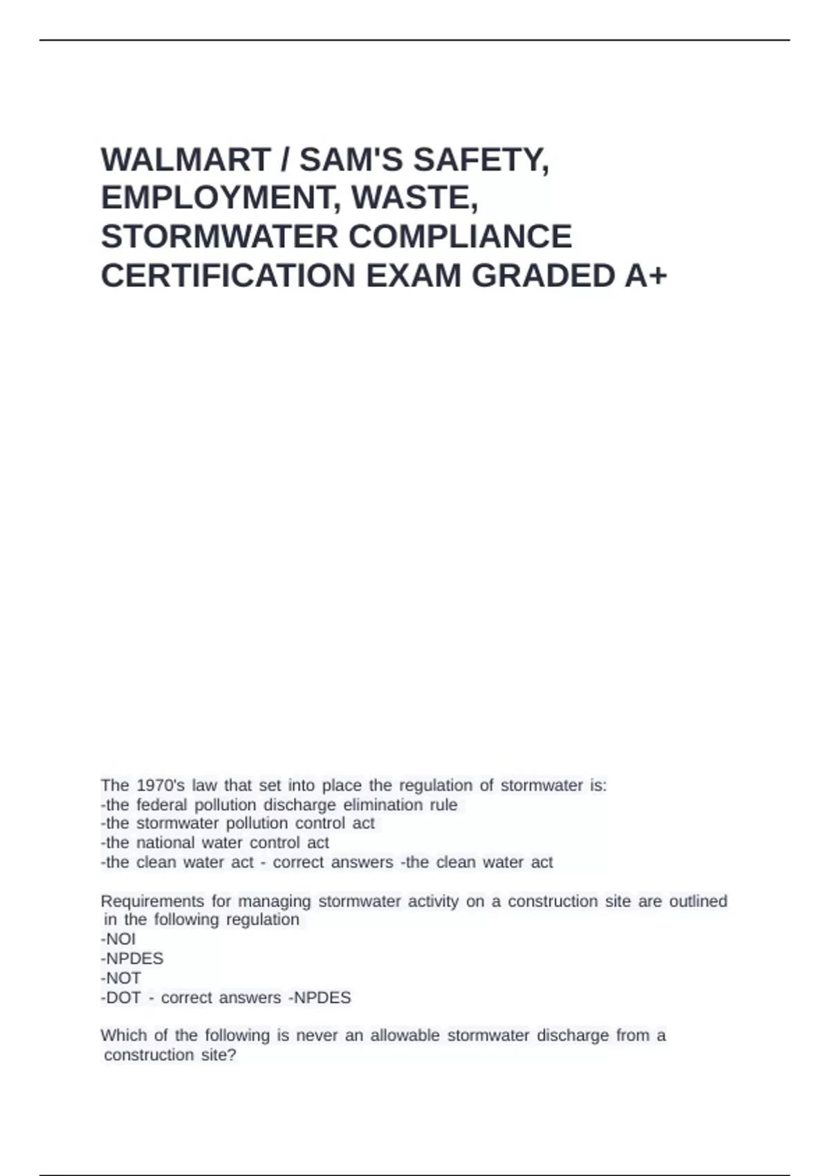 Walmart - Sam-s Safety, Employment, Waste, Stormwater Compliance Certification exam graded a+