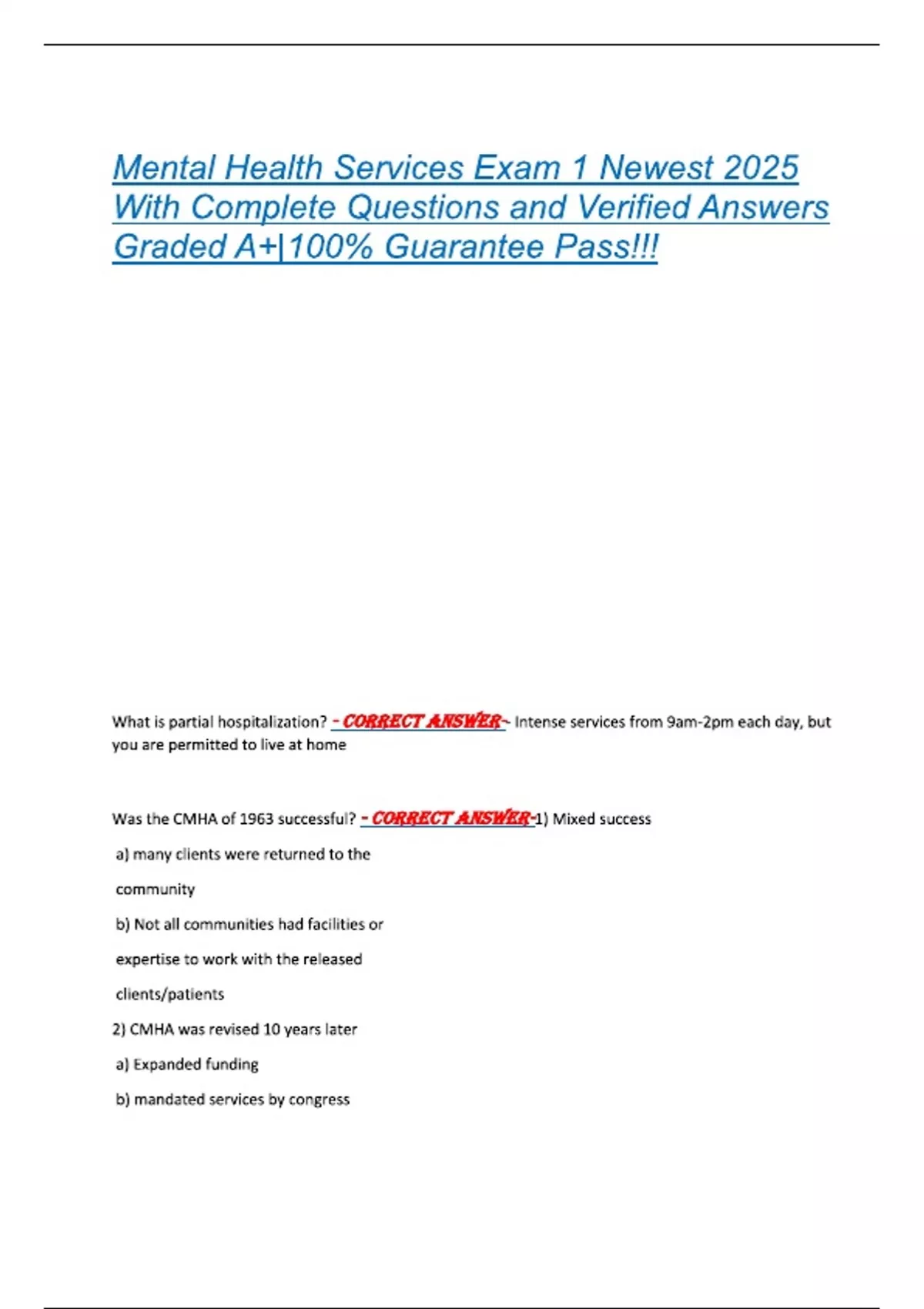 Mental Health Services Exam 1 Newest 2025 With Complete Questions and Verified Answers Graded A+|100% Guarantee Pass!!! Mental Health Services Exam 1 Newest 2025 With Complete Questions and Verified Answers Graded A+|100% Guarantee Pass!!!