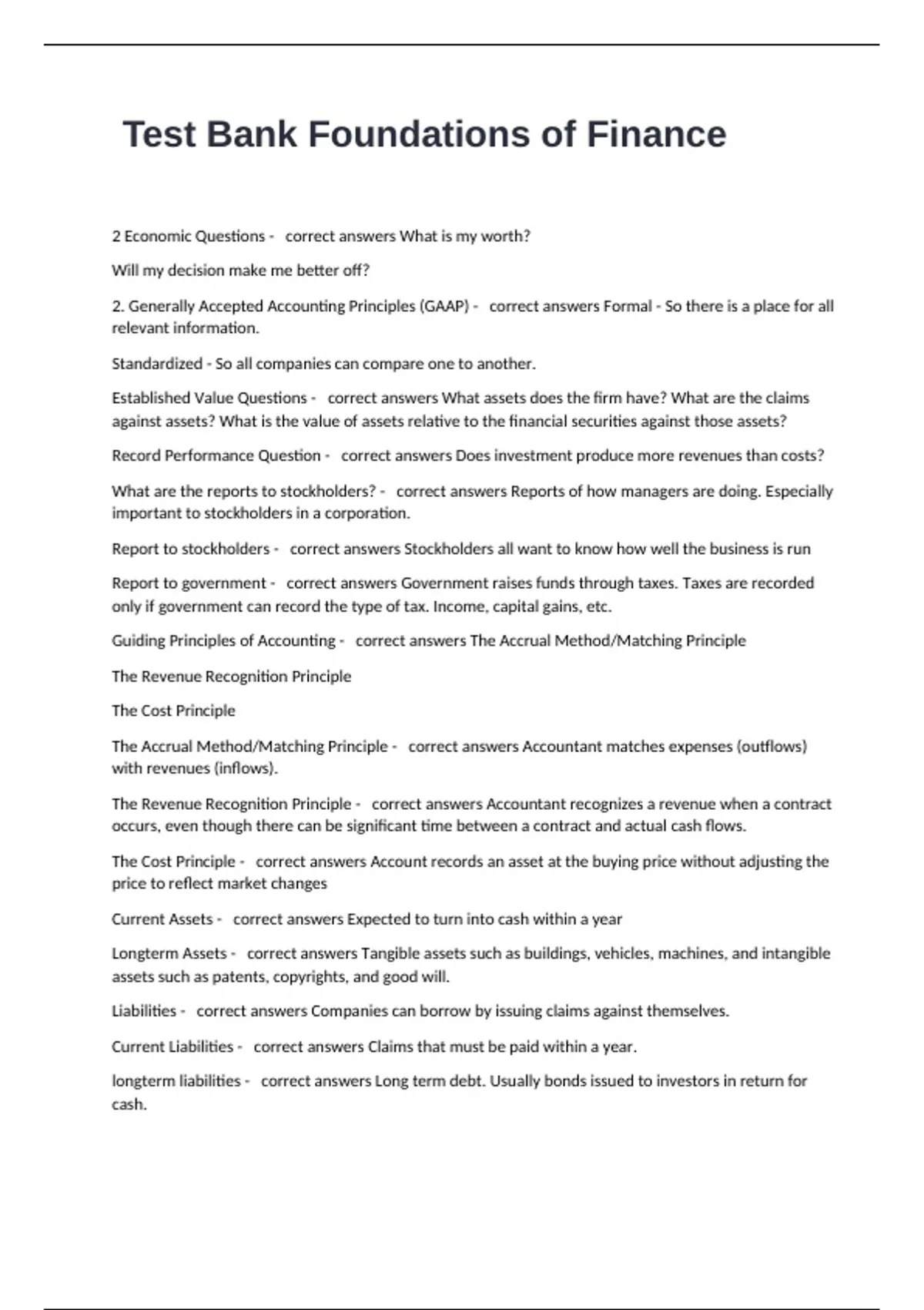 Test Bank Foundations of Finance 2 Economic Questions - correct answers What is my worth? Will my decision make me better off? 2. Generally Accepted Accounting Principles (GAAP) - correct answers Formal - So there is a place for all relevant information. Standardized - So all companies can compare one to another. Established Value Questions - correct answers What assets does the firm have? What are the claims against assets? What is the value of assets relative to the financial securities against those assets? Record Performance Question - correct answers Does investment produce more revenues than costs? What are the reports to stockholders? - correct answers Reports of how managers are doing. Especially important to stockholders in a corporation. Report to stockholders - correct answers Stockholders all want to know how well the business is run Report to government - correct answers Government raises funds through taxes. Taxes are recorded only if government can record the type of tax. Income, capital gains, etc. Guiding Principles of Accounting - correct answers The Accrual Method/Matching Principle The Revenue Recognition Principle