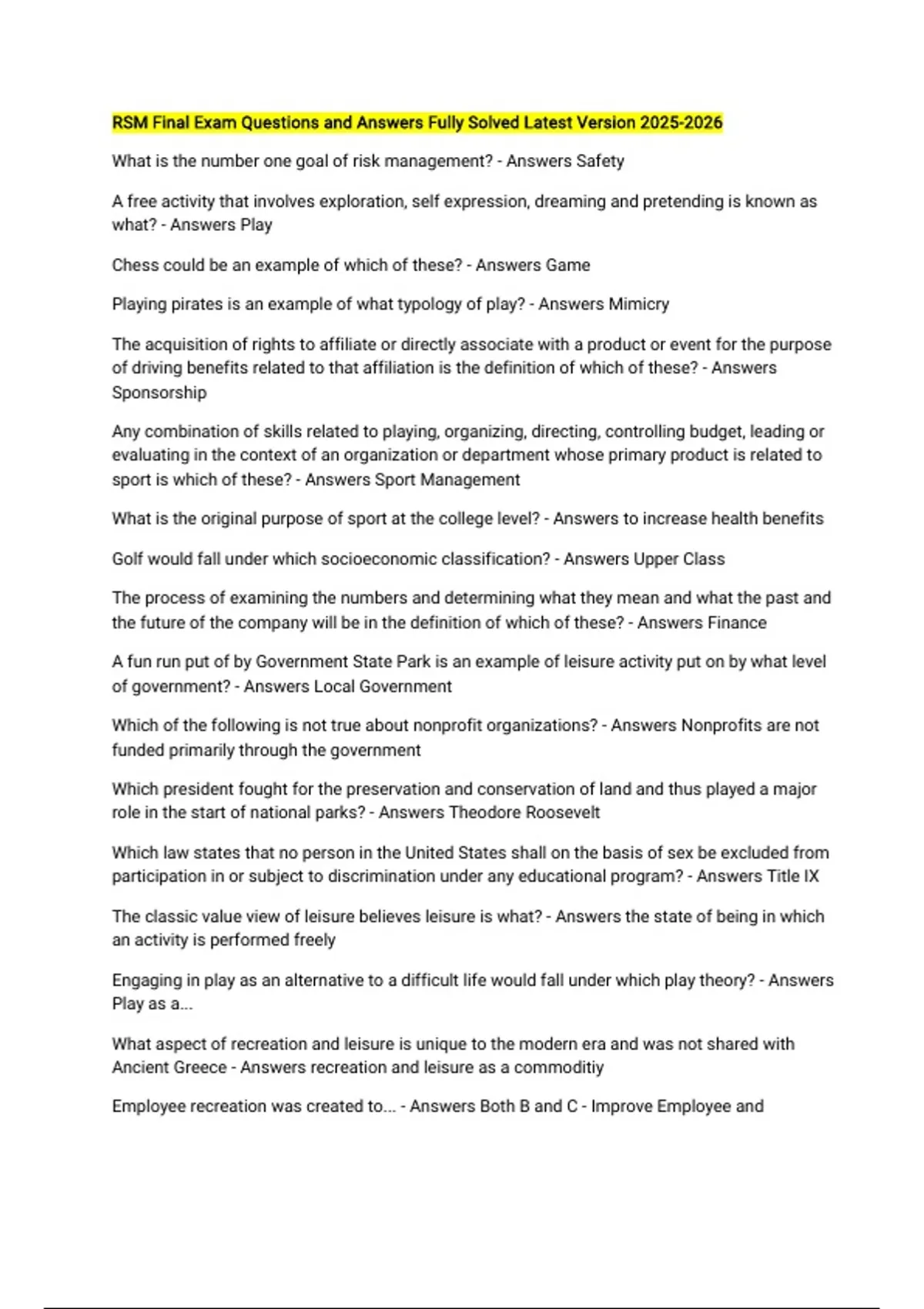 RSM Final Exam Questions and Answers Fully Solved Latest Version What is the number one goal of risk management? - Answers Safety A free activity that involves exploration, self expression, dreaming and pretending is known as what? - Answers Play Chess could be an example of which of these? - Answers Game Playing pirates is an example of what typology of play? - Answers Mimicry The acquisition of rights to affiliate or directly associate with a product or event for the purpose of driving benefits related to that affiliation is the definition of which of these? - Answers Sponsorship Any combination of skills related to playing, organizing, directing, controlling budget, leading or evaluating in the context of an organization or department whose primary product is related to sport is which of these? - Answers Sport Management What is the original purpose of sport at the college level? - Answers to increase health benefits Golf would fall under which socioeconomic classification? - Answers Upper Class The process of examining the numbers and determining what they mean and what the past and the future of the company will be in the definition of which of these? - Answers Finance A fun run put of by Government State Park is an example of leisure activity put on by what level of government? - Answers Local Government Which of the following is not true about nonprofit organizations? - Answers Nonprofits are not funded primarily through the government Which president fought for the preservation and conservation of land and thus played a major role in the start of national parks? - Answers Theodore Roosevelt Which law states that no person in the United States shall on the basis of sex be excluded from participation in or subject to discrimination under any educational program? - Answers Title IX The classic value view of leisure believes leisure is what? - Answers the state of being in which an activity is performed freely Engaging in play as an alternative to a difficult life would fall under which play theory? - Answers Play as a... What aspect of recreation and leisure is unique to the modern era and was not shared with Ancient Greece - Answers recreation and leisure as a commoditiy Employee recreation was created to... - Answers Both B and C - Improve Employee and Employer and Promote Positive Fitness and Health Initatives Which of the following is not a reason that sponsorship has grown to the size it has today? - Answers the band on alcohol advertising Which of the following is not a reason for growth in recreation and leisure? - Answers Emphasis on religion Which of the following is not a defining characteristic of recreation? - Answers must be an obligation Which of the following has not been a reason for an increased focus on recreation and leisure in the modern era? - Answers all of the above (Reduction of work hours, decline in worth ethic, national affluence, form structure and activities) Which of the following has not influenced the growth and size of the sport industry? - Answers reduction of corporate sponsors (has increased the industry)