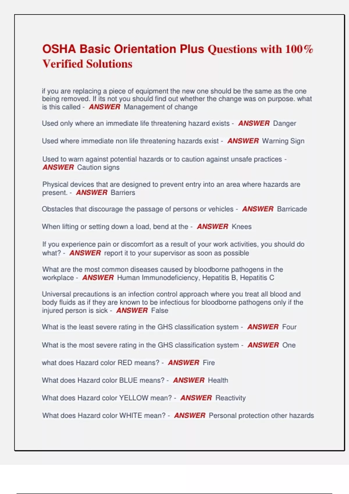 OSHA Basic Orientation Plus Questions with 100% Verified Solutions if you are replacing a piece of equipment the new one should be the same as the one being removed. If its not you should find out whether the change was on purpose. what is this called - ANSWER Management of change Used only where an immediate life threatening hazard exists - ANSWER Danger Used where immediate non life threatening hazards exist - ANSWER Warning Sign Used to warn against potential hazards or to caution against unsafe practices - ANSWER Caution signs Physical devices that are designed to prevent entry into an area where hazards are present. - ANSWER Barriers Obstacles that discourage the passage of persons or vehicles - ANSWER Barricade When lifting or setting down a load, bend at the - ANSWER Knees If you experience pain or discomfort as a result of your work activities, you should do what? - ANSWER report it to your supervisor as soon as possible What are the most common diseases caused by bloodborne pathogens in the workplace - ANSWER Human Immunodeficiency, Hepatitis B, Hepatitis C Universal precautions is an infection control approach where you treat all blood and body fluids as if they are known to be infectious for bloodborne pathogens only if the injured person is sick - ANSWER False What is the least severe rating in the GHS classification system - ANSWER Four What is the most severe rating in the GHS classification system - ANSWER One what does Hazard color RED means? - ANSWER Fire What does Hazard color BLUE means? - ANSWER Health What does Hazard color YELLOW mean? - ANSWER Reactivity What does Hazard color WHITE mean? - ANSWER Personal protection other hazards ans special precautions What does the HMIS color BLUE indicate? - ANSWER Health What does the HMIS color ORANGE indicate? - ANSWER Physical hazard What does the HMIS color RED indicate? - ANSWER Flammability What does the HMIS color WHITE indicate? - ANSWER Required personal protective equipment In what section of the SDS can you find the hazards of hydrogen sulfide - ANSWER Section 2 Which section of the SDS lists the measures should you take if exposed to hydrogen sulfide? - ANSWER section 4 Where in the SDS can you find what, if any, personal protective equipment (PPE) is required? - ANSWER Section 8 Physical/health hazards cause illness or injury - ANSWER True always test the atmosphere in the work area prior to starting the job when the site is greater than how many feet? - ANSWER four For an excavation that is 4 feet deep or more, egress points must be spaced no more than how many feet of lateral travel for employees? - ANSWER 25 narrow excavation made below the surface of the ground in which the depth is usually greater than the width and the width does not exceed how many fee? - ANSWER 15 What are the main methods for protecting workers from a cave-in - ANSWER Shielding, Sloping, shoring In an emergency you should call emergency response with the - ANSWER Exact location, number of victims Excavation measurements, special hazards at the location What elements are required in order for a fire to happen? - ANSWER Heat, fuel, oxygen What color does white represent under the NFPA label - ANSWER Other hazards and special precautions what is used on scaffolding after inspections are completed - ANSWER Scaffold tags what are base plates and mudsills used for? - ANSWER Distribute scaffold load weight What is performed regularly at job sites - ANSWER Inspections What are four main types of scaffolds - ANSWER Frame, rolling, tube, system A vertical barrier at floor level erected along exposed edges of a floor opening wall opening, platform, runway, or ramp to prevent falls of materials. - ANSWER Toe board what is an opening in the floor, platform or pavement measuring 12 inches or more and through which people may fall? - ANSWER Floor hole What is an opening in the floor, platform or pavement measuring less than 12 inches but more than one inch through which materials, but not people may fall called? - ANSWER Floor opening what is the first step in lockout/tagout to prevent the unexpected release of energy - ANSWER Preparation for shutdown What is the most frequently cited OSHA violation? - ANSWER Fall Protection What key elements are essential to recognizing hazards and reducing or eliminating workplace hazards? - ANSWER Management commitment and employee involvement You are encouraged to ask your coworkers/supervisor for information whenever you have a problem or are in doubt about what to do on a job? - ANSWER True It is your responsibility to follow all safety regulations, inform your employer of any unsafe condition; report all injuries no matter how minor they seem and wear the proper personal protective equipment? - ANSWER True The OSHA standard that addresses the requirements for preventing and lessening the results of a bad release of toxic, reactive, flammable, or highly explosive hazardous chemicals from a process - ANSWER Process safety management Standard The process Hazard Analysis (PHA) is one of the most important parts of the PSM program. PHAs are used to identify and evaluate major processes and ensure they are - ANSWER Evaluated, Controlled, and Identified In the PSM standard OSHA states employees must be trained if they work with highly hazardous chemicals. - ANSWER True