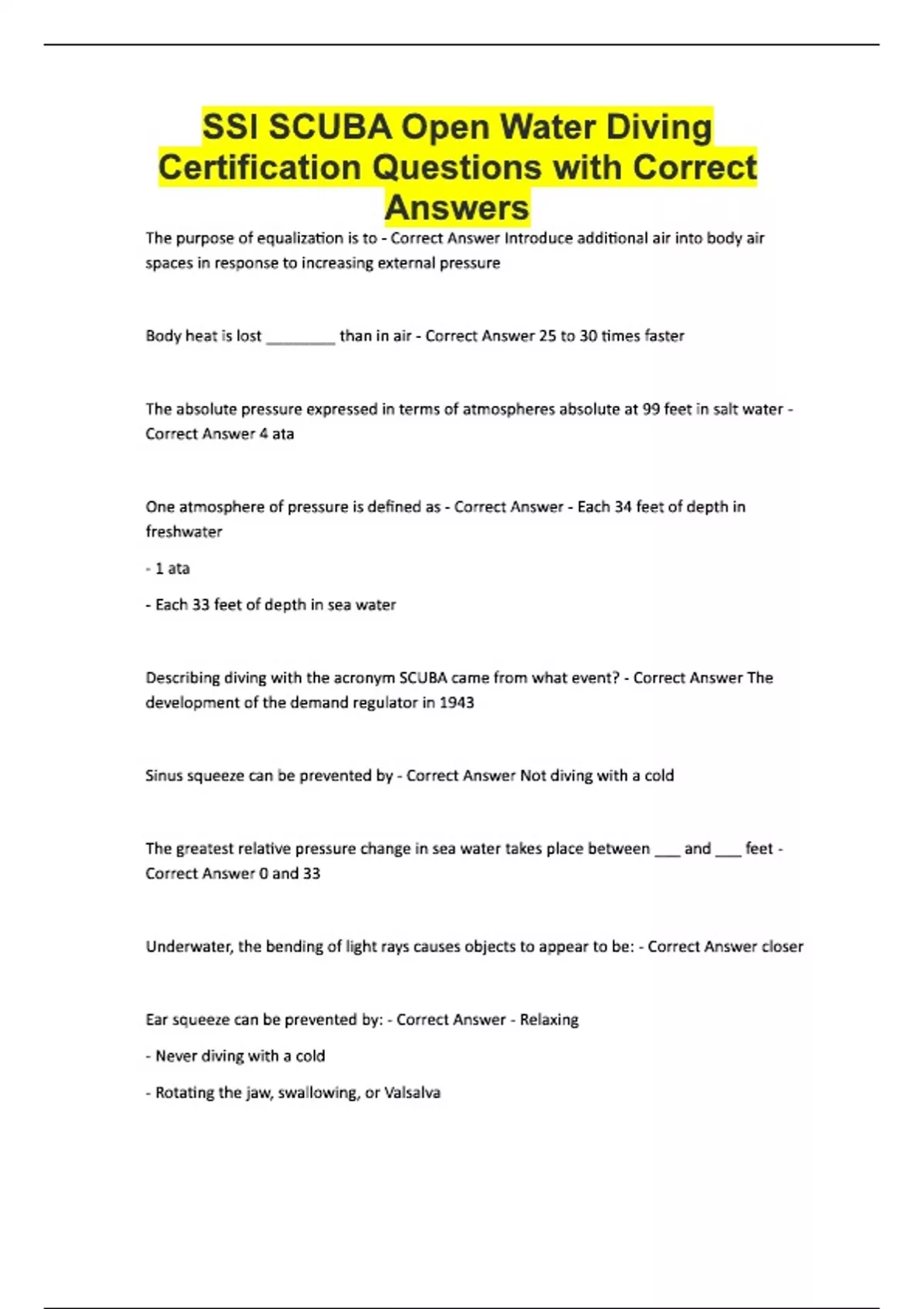 SSI SCUBA Open Water Diving Certification Questions with Correct Answers The purpose of equalization is to - Correct Answer Introduce additional air into body air spaces in response to increasing external pressure Body heat is lost ________ than in air - Correct Answer 25 to 30 times faster The absolute pressure expressed in terms of atmospheres absolute at 99 feet in salt water - Correct Answer 4 ata One atmosphere of pressure is defined as - Correct Answer - Each 34 feet of depth in freshwater - 1 ata - Each 33 feet of depth in sea water Describing diving with the acronym SCUBA came from what event? - Correct Answer The development of the demand regulator in 1943 Sinus squeeze can be prevented by - Correct Answer Not diving with a cold The greatest relative pressure change in sea water takes place between ___ and ___ feet - Correct Answer 0 and 33 Underwater, the bending of light rays causes objects to appear to be: - Correct Answer closer Ear squeeze can be prevented by: - Correct Answer - Relaxing - Never diving with a cold