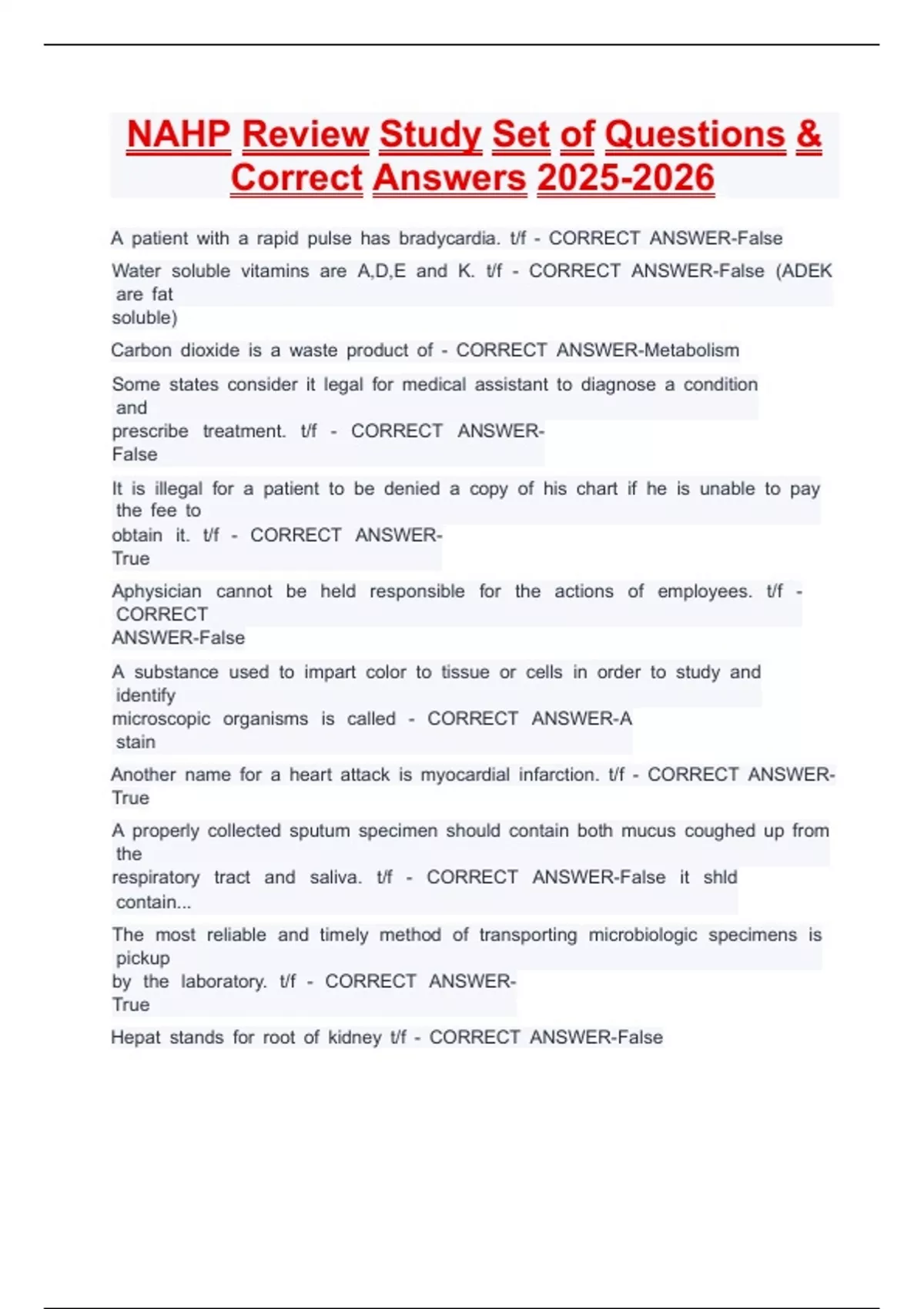 NAHP Review Study Set of Questions & Correct Answers