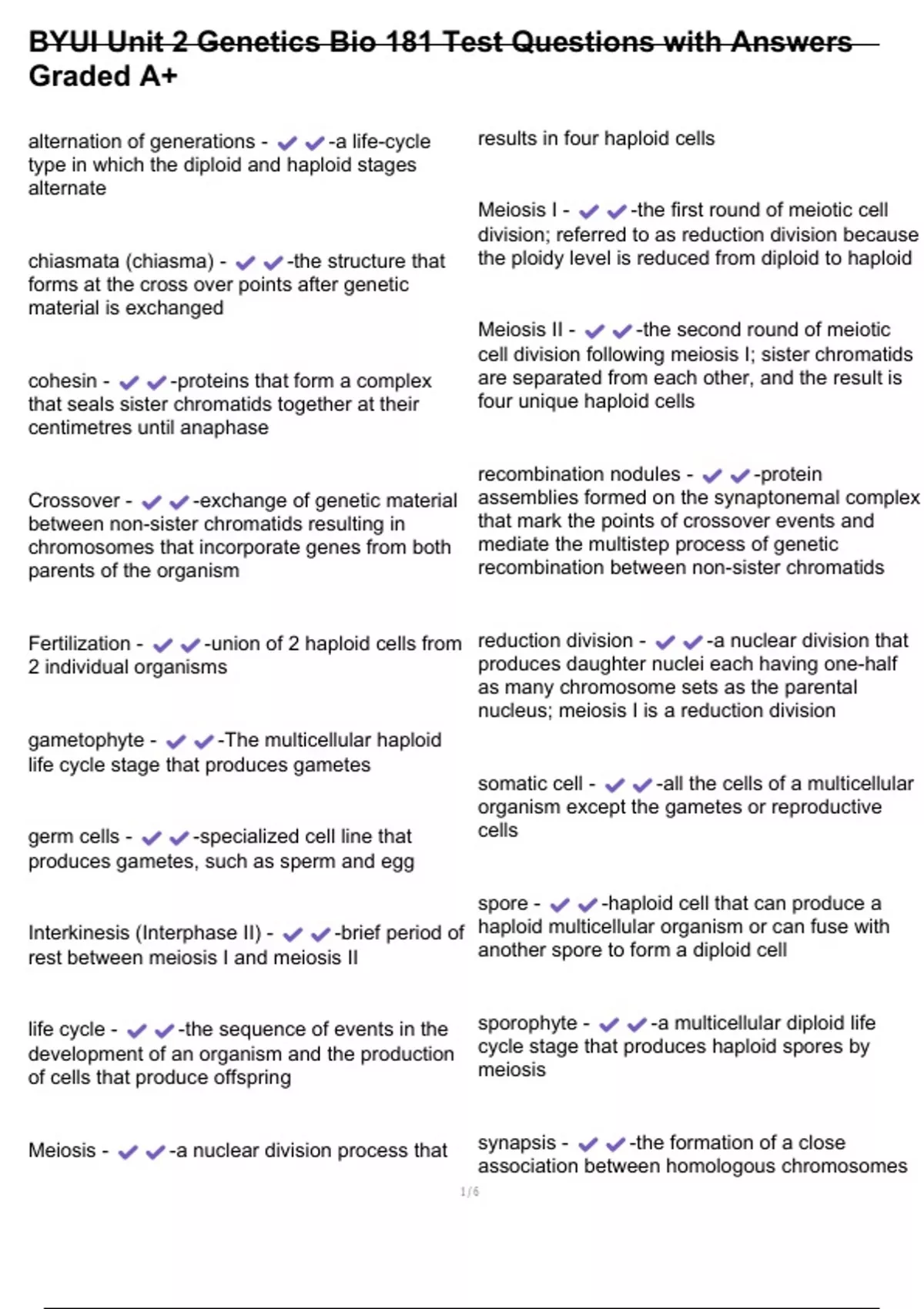 , BYUI Unit 2 Genetics Bio 181 Test Questions with Answers