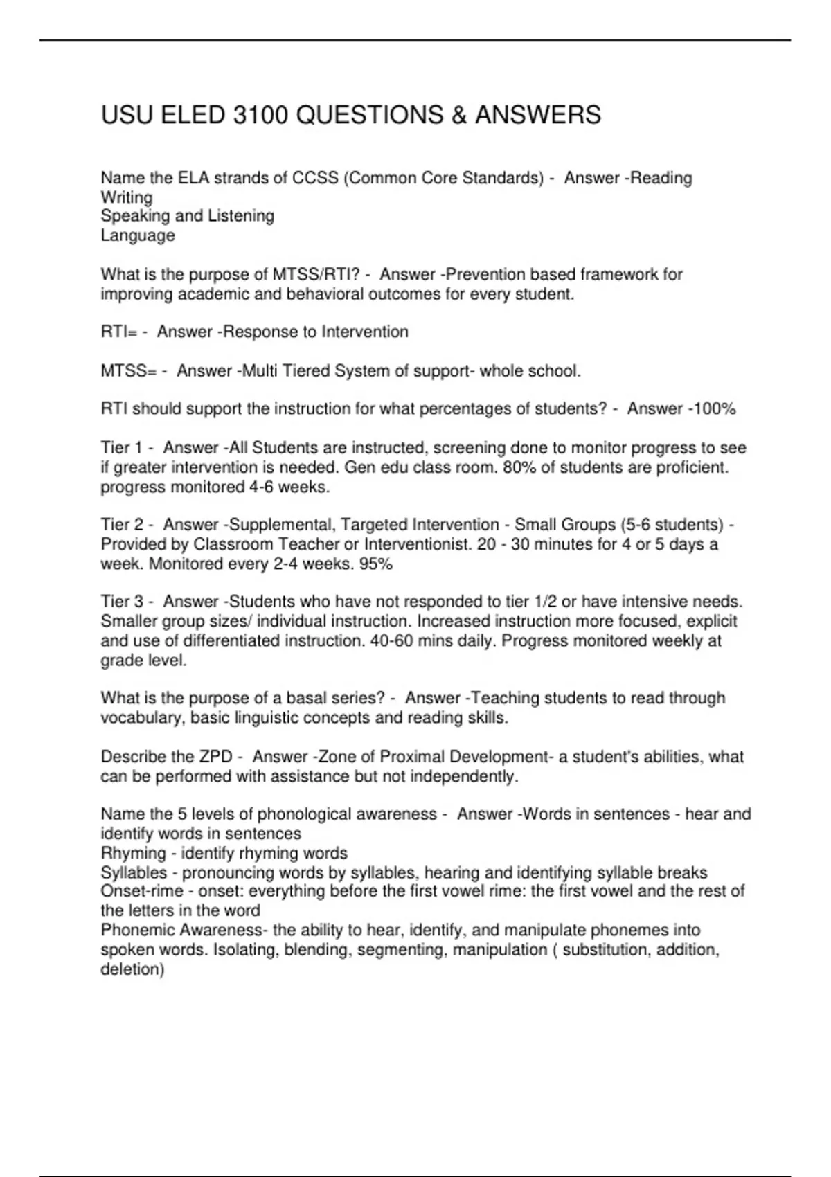 USU ELED 3100 QUESTIONS & ANSWERS What is the single most distinguishing feature about phonemic awareness? - Answer -It's all sound and images, no text What are phonemes? - Answer -The smallest unit of sound Ex: spoon has 4 phonemes What is a consonant blend? - Answer -2 or more consonants that make 2 sounds. example: blend What is a consonant digraph? - Answer -2 consonants that make 1 sound. example: shoe What is a diphthong? - Answer -A diphthong is a sound that is formed by the combination of two vowels in a single syllable, and the sound begins as one vowel and moves to another. example: boy, coin, oil What are decodable words? - Answer -Non-sight words/high frequency words that can be broken into parts to figure out what a word is example: sub-sti-tute What is onset-rime? - Answer -onset is everything in a word before the first vowel rime is the first vowel and everything that comes after it example: the word scratch onset = scr rime = atch What is morphemic analysis? - Answer -Morphemic analysis is the strategy used to find the meaning of a word by examining its meaningful