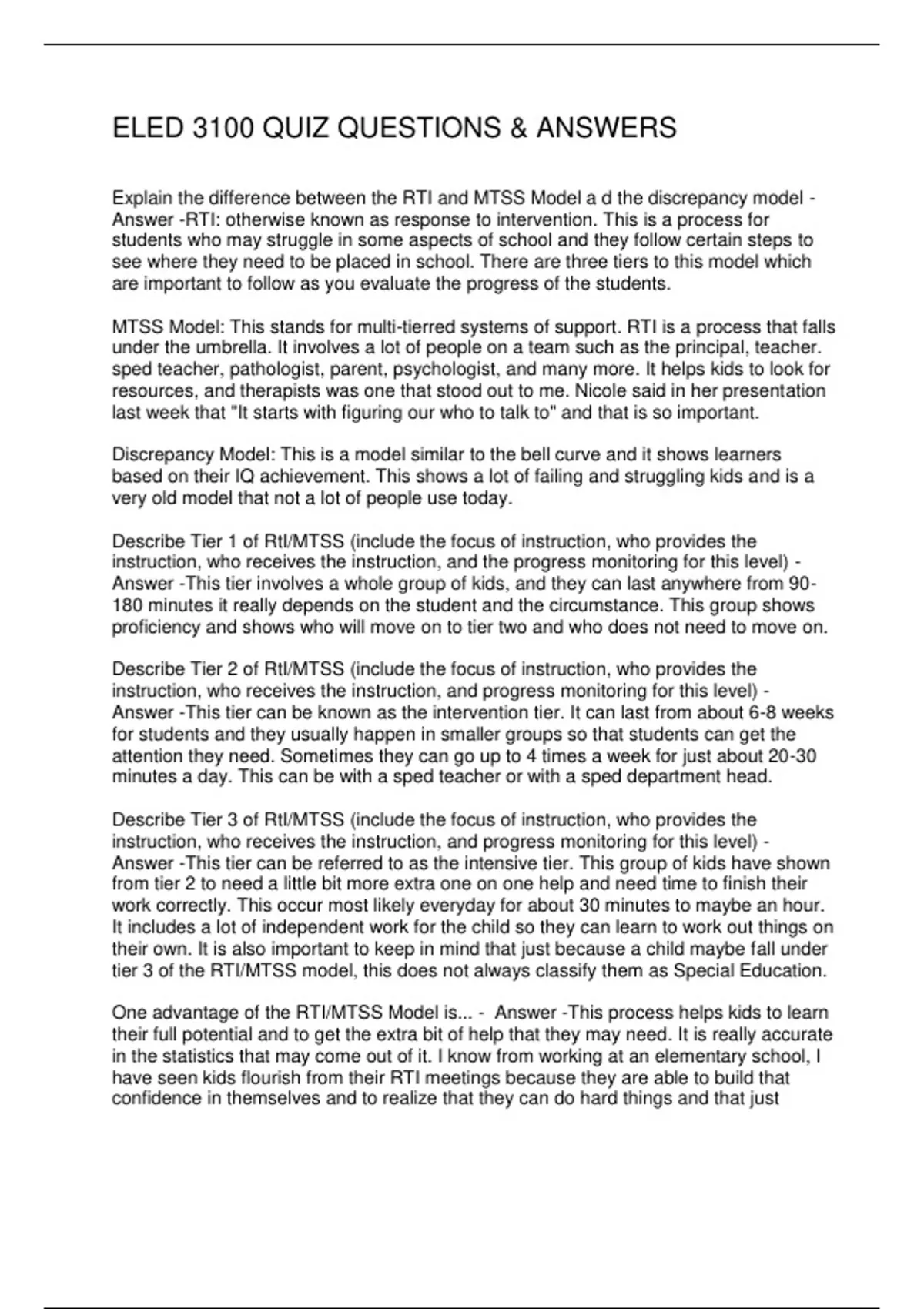 ELED 3100 QUIZ QUESTIONS & ANSWERS LIST and EXPLAIN the 5 parts of effective, explicit instruction. - Answer -1- Clear explanation of the objective. This is where you explain what will be taught and what is expected of the students. Students should be able to restate lesson back to you as you explain it. Make sure to use teacher enthusiasm and to make it super clear, clarity is so important for young kids. State the purpose of why they will be learning whatever it is they are learning. 2. Modeling the process. (I do) Be brief, don't be too wordy, kids will zone out. Make sure to think out loud and let them in on all your secrets on how you do the assignment. Uses phrases like "I do" and just first person language in general. Show examples, and use your teacher voice, be enthusiastic and fun, don't talk in such a way that students start to daze off. 3- Guided practice. Let the student show some sense of independent. Let them work on their own and walk around the class, and make sure to give corrective feedback where needed. It gives them an opportunity to show you how responsible they can be. Still make sure that you are actively seeking to