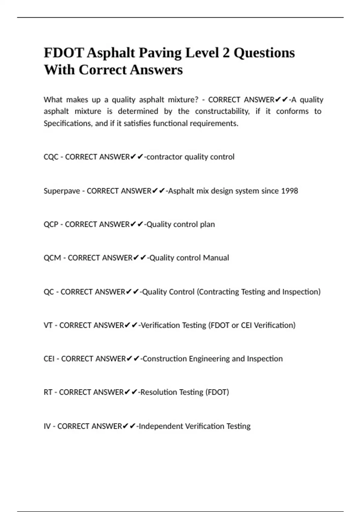 FDOT Asphalt Paving Level 2 Questions With Correct Answers