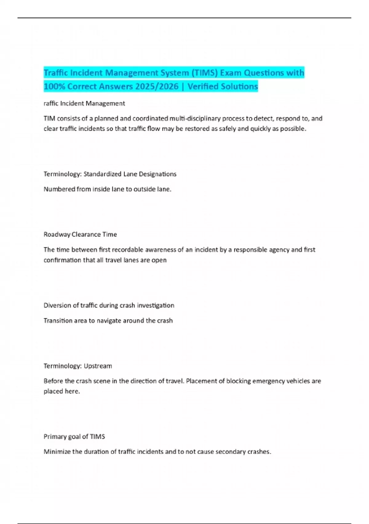 Traffic Incident Management System (TIMS) Exam Questions with 100% Correct Answers 2025/2026 | Verified Solutions