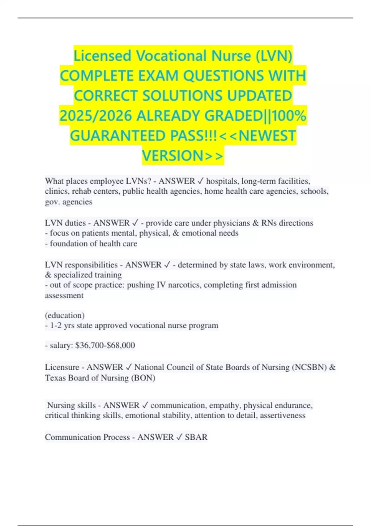 What places employee LVNs? - ANSWER ✓ hospitals, long-term facilities,