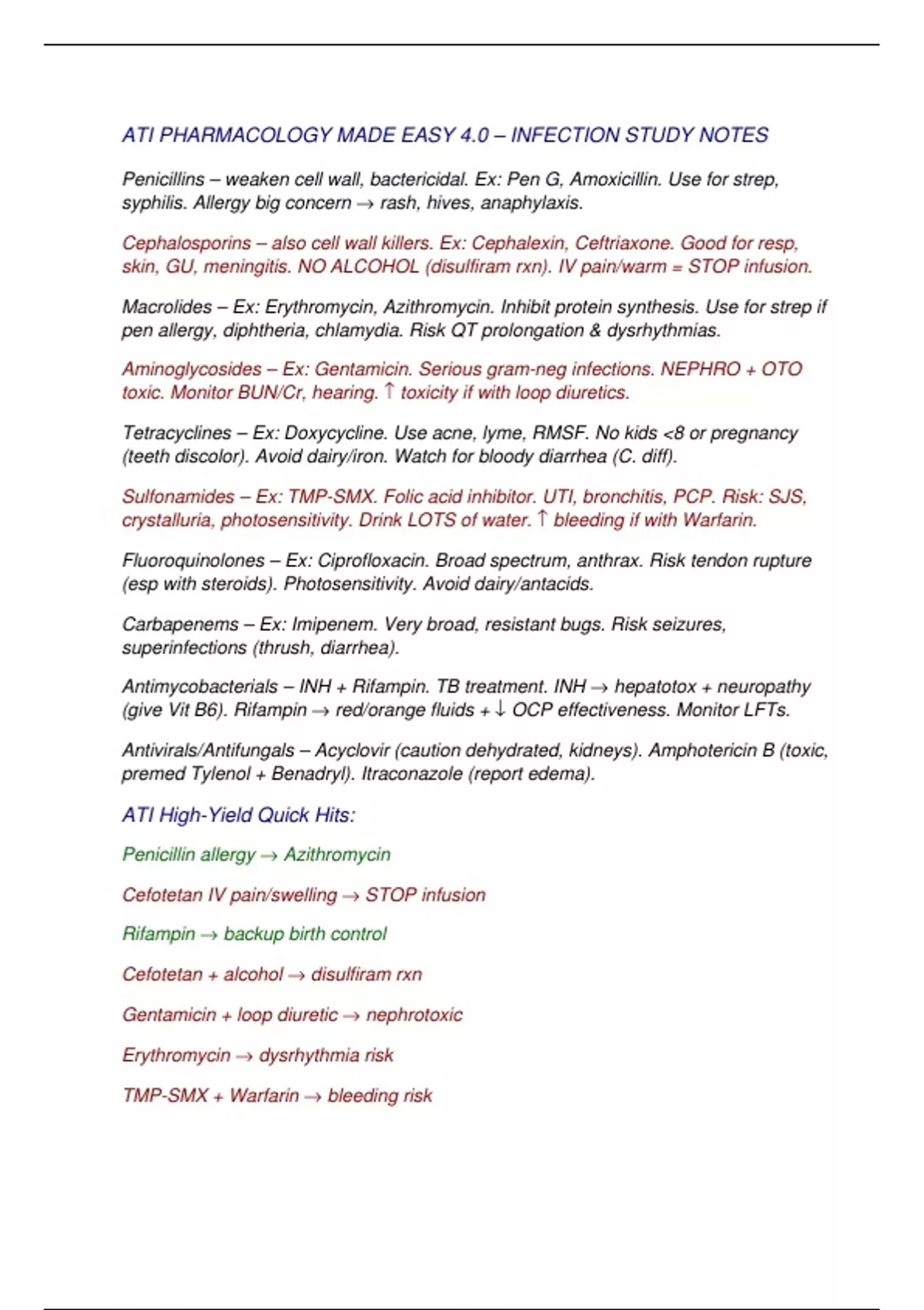 ATI PHARMACOLOGY MADE EASY 4.0 – INFECTION STUDY NOTES