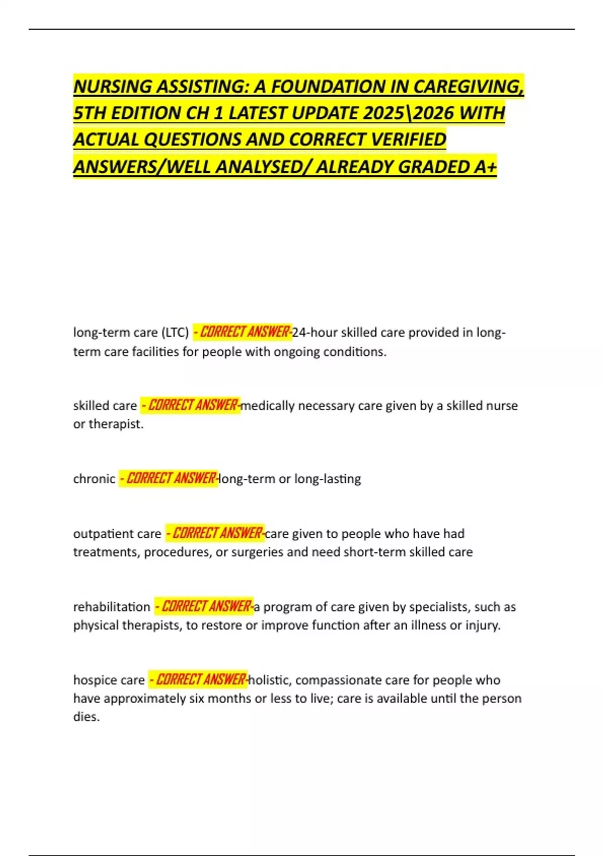 long-term care (LTC) - CORRECT ANSWER-24-hour skilled care provided in long-