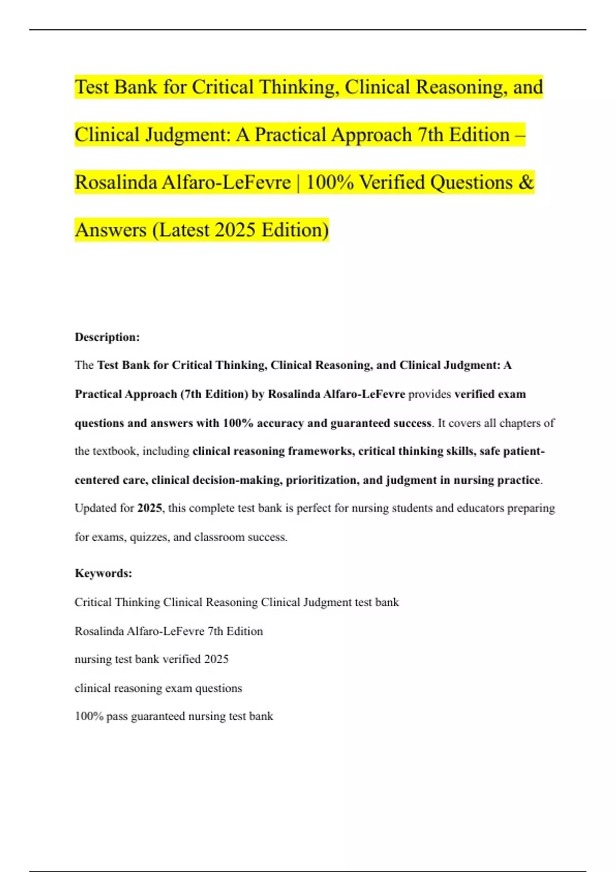 The Test Bank for Critical Thinking, Clinical Reasoning, and Clinical Judgment: A