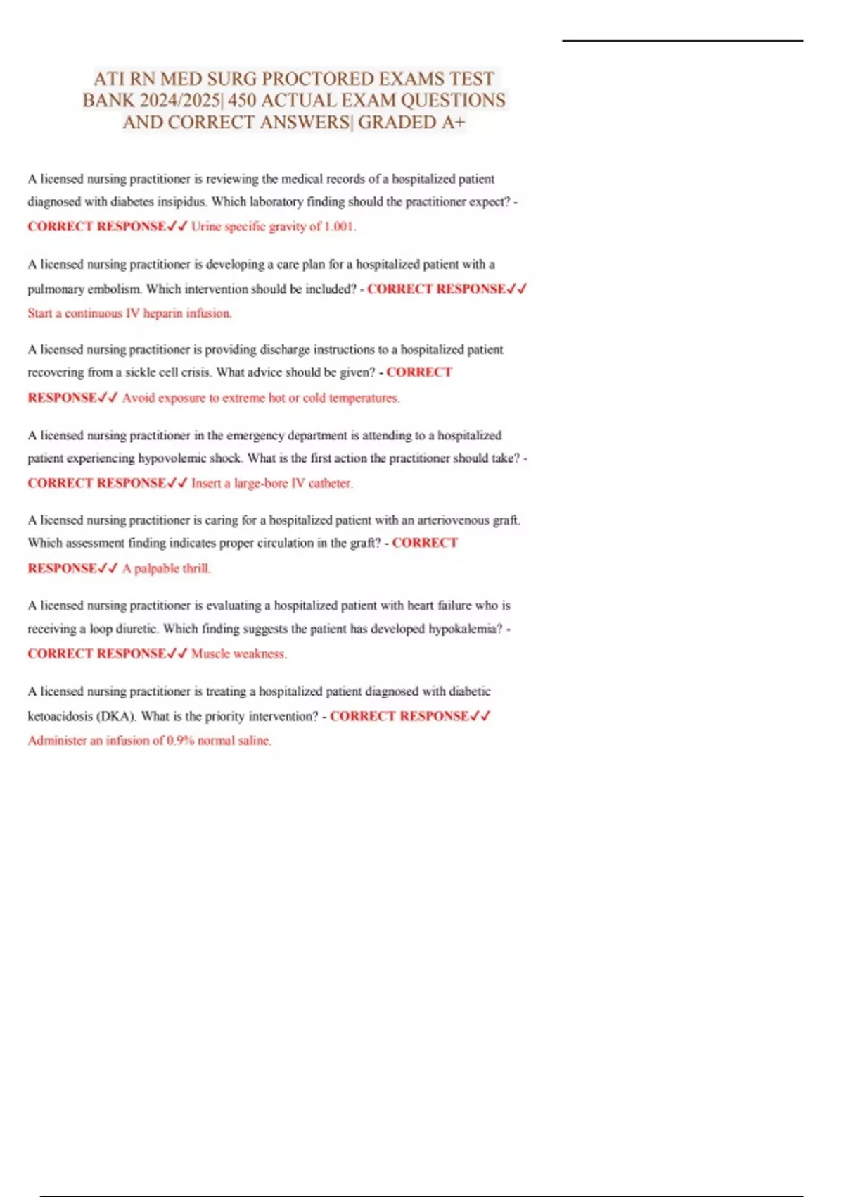 Ace your exams with the ATI RN Medical-Surgical Proctored Exams Test Banks 2025–2026, packed with 450 real and practice exam questions and answers, Grade A+ Guaranteed. This comprehensive resource is designed to cover every major system, including cardiovascular, respiratory, endocrine, renal, neurological, gastrointestinal, and more—giving you the most complete prep experience. Questions reflect the latest ATI test standards and NCLEX-style format to sharpen your critical thinking and clinical judgment. Whether you’re preparing for a class proctored exam or building confidence for the NCLEX, this test bank equips you with the knowledge, strategies, and practice you need to succeed.
