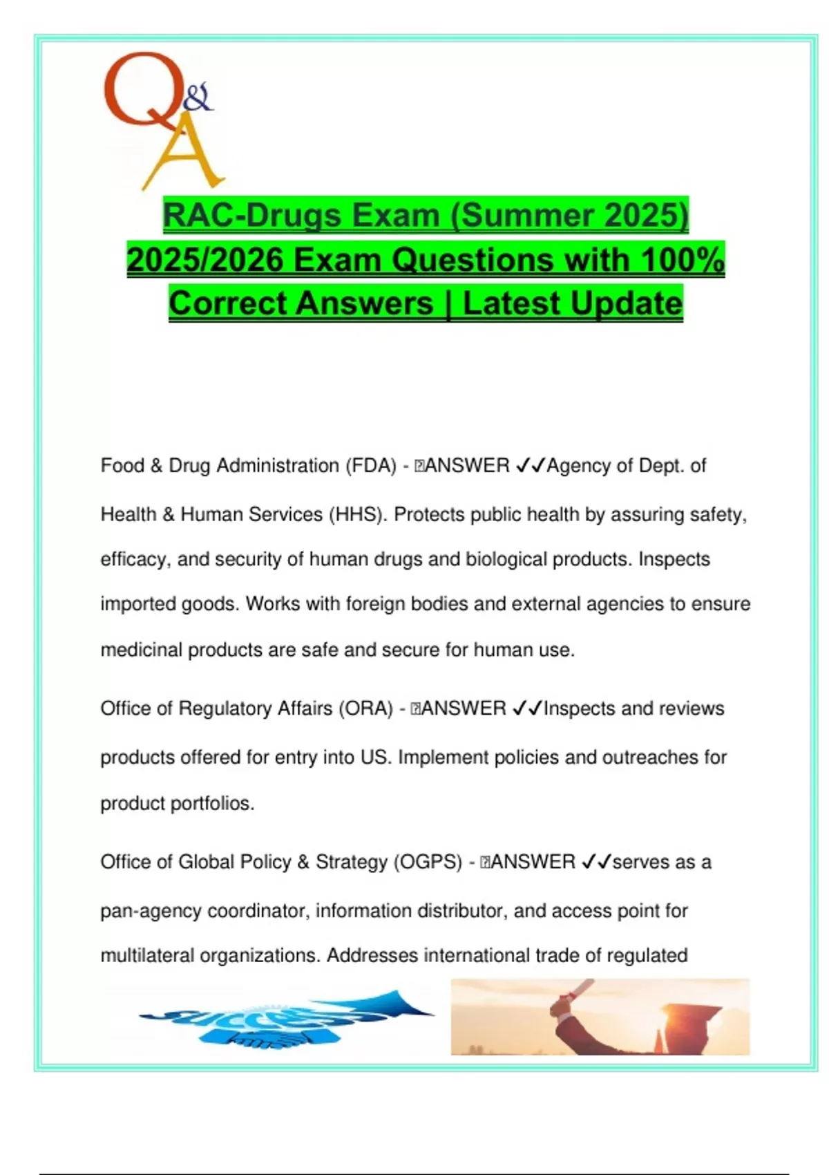 RAC-Drugs Exam (Summer 2025) 2025/2026 Exam Questions with 100% Correct Answers | Latest Update Food & Drug Administration (FDA) -