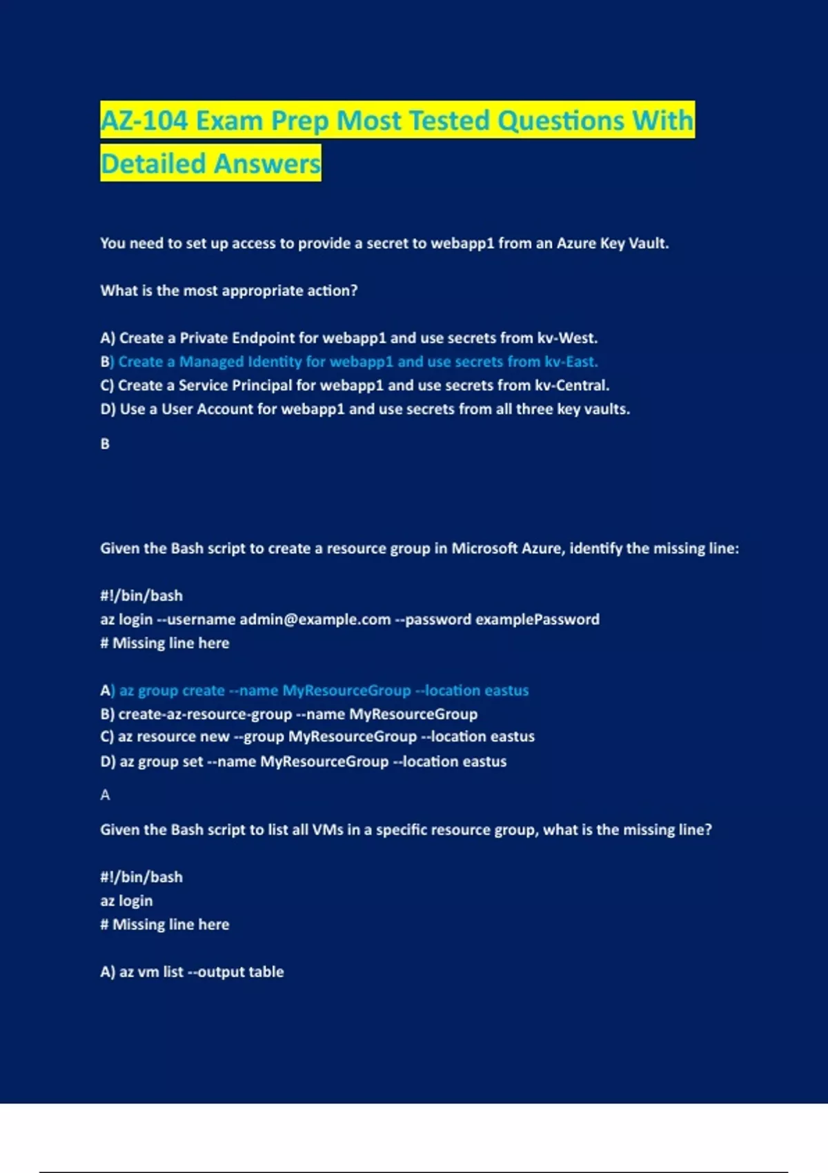 AZ-104 Exam Prep Most Tested Questions With Detailed Answers You need to set up access to provide a secret to webapp1 from an Azure Key Vault. What is the most appropriate action? A) Create a Private Endpoint for webapp1 and use secrets from kv-West. B) Create a Managed Identity for webapp1 and use secrets from kv-East. C) Create a Service Principal for webapp1 and use secrets from kv-Central. D) Use a User Account for webapp1 and use secrets from all three key vaults. B Given the Bash script to create a resource group in Microsoft Azure, identify the missing line: #!/bin/bash az login --username --password examplePassword # Missing line here A) az group create --name MyResourceGroup --location eastus B) create-az-resource-group --name MyResourceGroup C) az resource new --group MyResourceGroup --location eastus D) az group set --name MyResourceGroup --location eastus A Given the Bash script to list all VMs in a specific resource group, what is the missing line? #!/bin/bash az login # Missing line here A) az vm list --output table B) az vm list --resource-group MyResourceGroup --output table C) list-az-vm --resource-group MyResourceGroup D) az vm show --resource-group MyResourceGroup