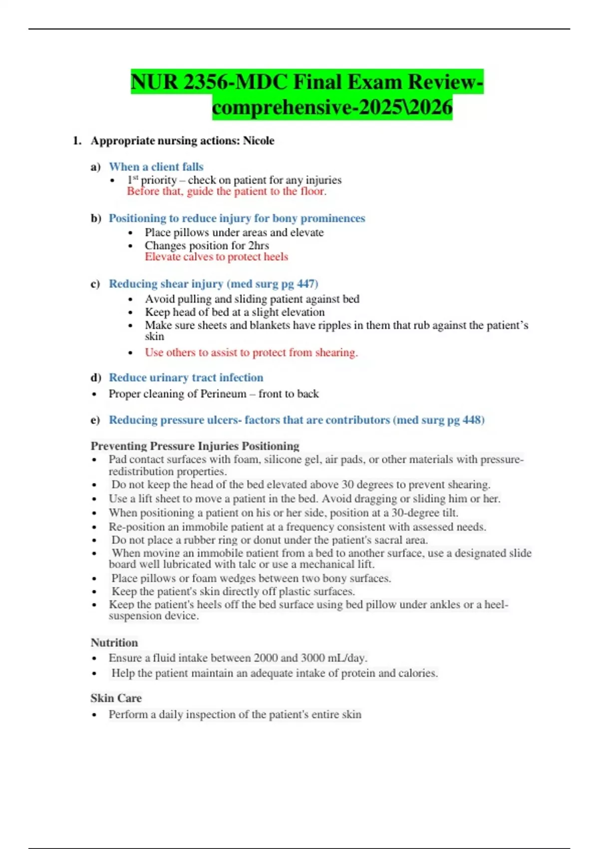 This document provides a comprehensive final exam review for NUR 2356 at MDC, updated for the 2025/2026 academic year. It covers all essential nursing concepts, clinical applications, and key topics required for exam preparation. The material is structured to support thorough study and understanding, helping students review effectively and achieve exam success.