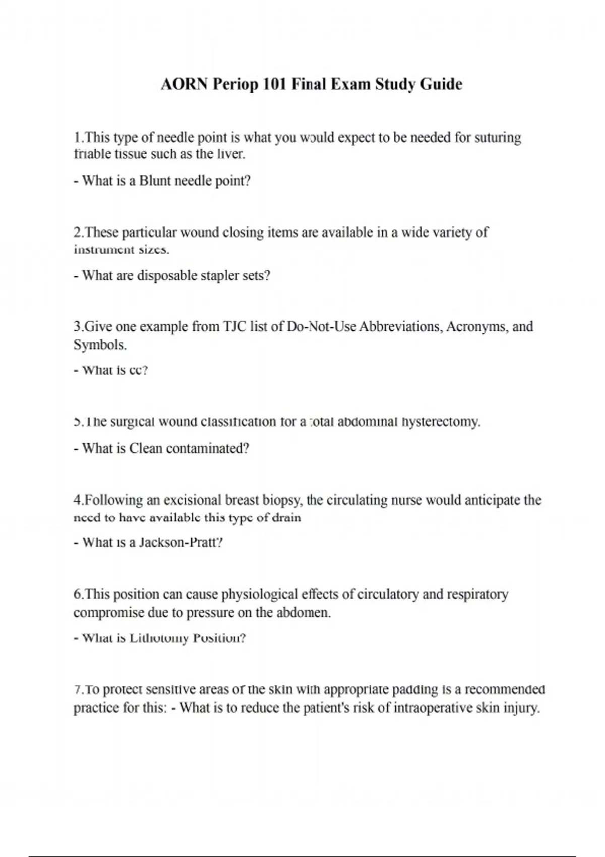 1.This type of needle point is what you would expect to be needed for suturing friable tissue such as the liver. - What is a Blunt needle point? 2.These particular wound closing items are available in a wide variety of instrument sizes. - What are disposable stapler sets? 3.Give one example from TJC list of Do-Not-Use Abbreviations, Acronyms, and Symbols. - What is cc? 5.The surgical wound classification for a total abdominal hysterectomy. - What is Clean contaminated? 4.Following an excisional breast biopsy, the circulating nurse would anticipate the need to have available this type of drain - What is a Jackson-Pratt? 6.This position can cause physiological effects of circulatory