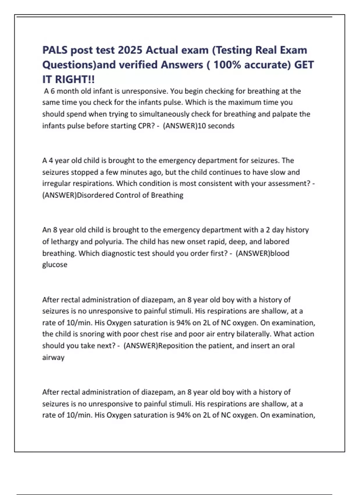 PALS post test 2025 Actual exam (Testing Real Exam Questions)and verified Answers ( 100% accurate) GET IT RIGHT!!