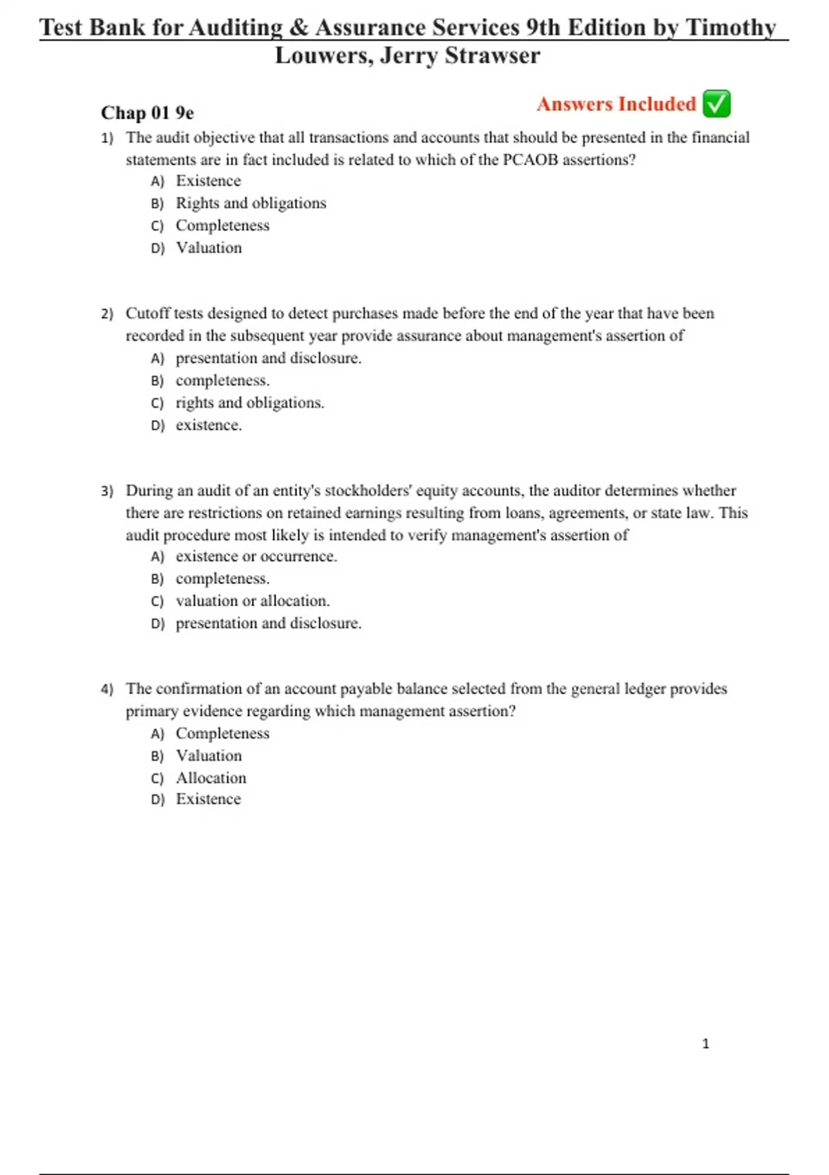 Test Bank for Auditing & Assurance Services 9th Edition by Timothy
