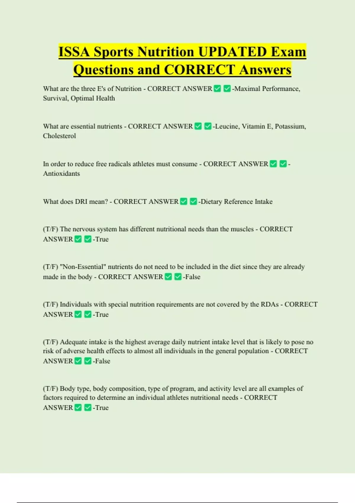 ISSA Sports Nutrition UPDATED Exam Questions and CORRECT Answers What are the three E's of Nutrition - CORRECT ANSWER Survival, Optimal Health What are essential nutrients - CORRECT ANSWER Cholesterol -Maximal Performance, -Leucine, Vitamin E, Potassium, In order to reduce free radicals athletes must consume - CORRECT ANSWER Antioxidants What does DRI mean? - CORRECT ANSWER -Dietary Reference Intake