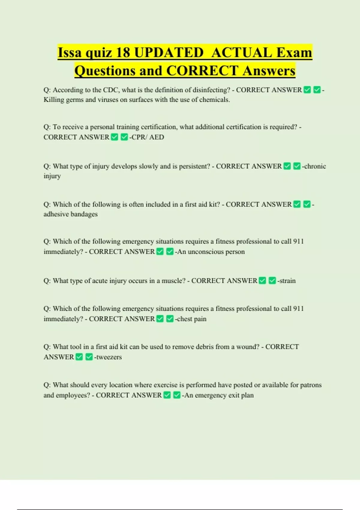 Issa quiz 18 UPDATED ACTUAL Exam Questions and CORRECT Answers Q: According to the CDC, what is the definition of disinfecting? - CORRECT ANSWER Killing germs and viruses on surfaces with the use of chemicals. Q: To receive a personal training certification, what additional certification is required? - CORRECT ANSWER -CPR/ AED