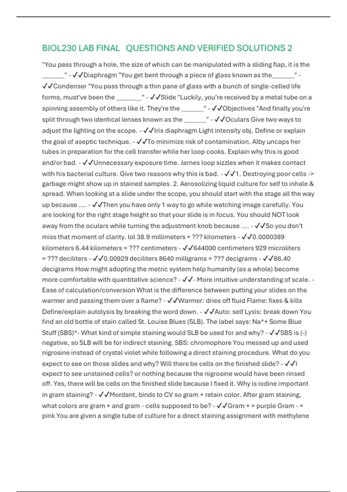 BIOL230 LAB FINAL QUESTIONS AND VERIFIED SOLUTIONS 2