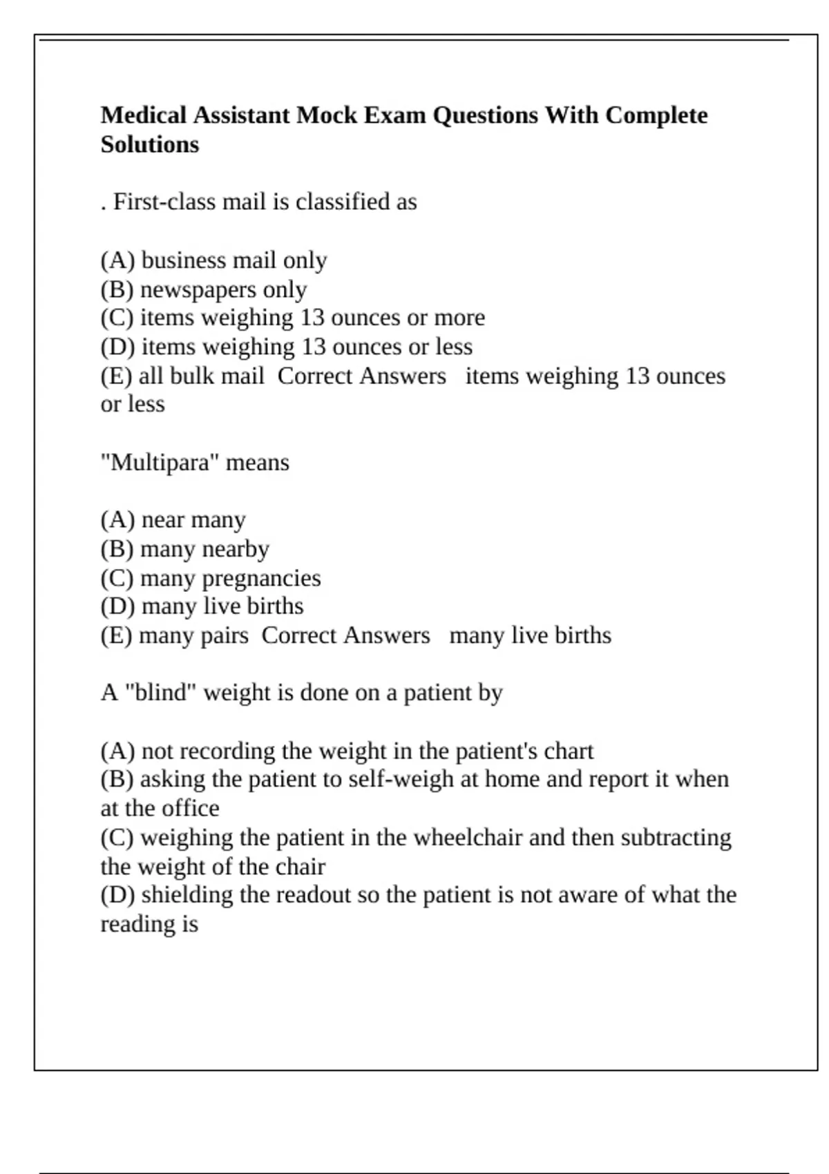 Medical Assistant Mock Exam Questions With Complete Solutions