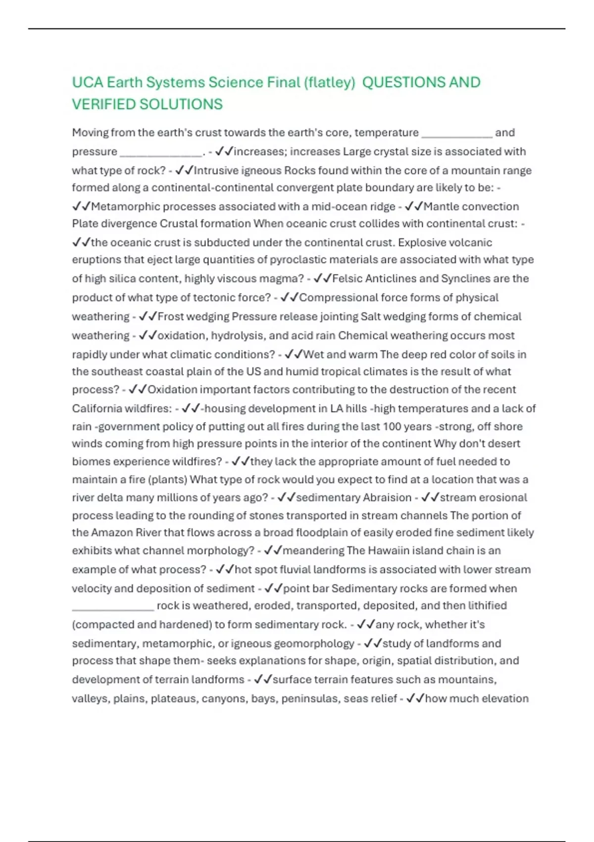 UCA Earth Systems Science Final (flatley) QUESTIONS AND VERIFIED SOLUTIONS