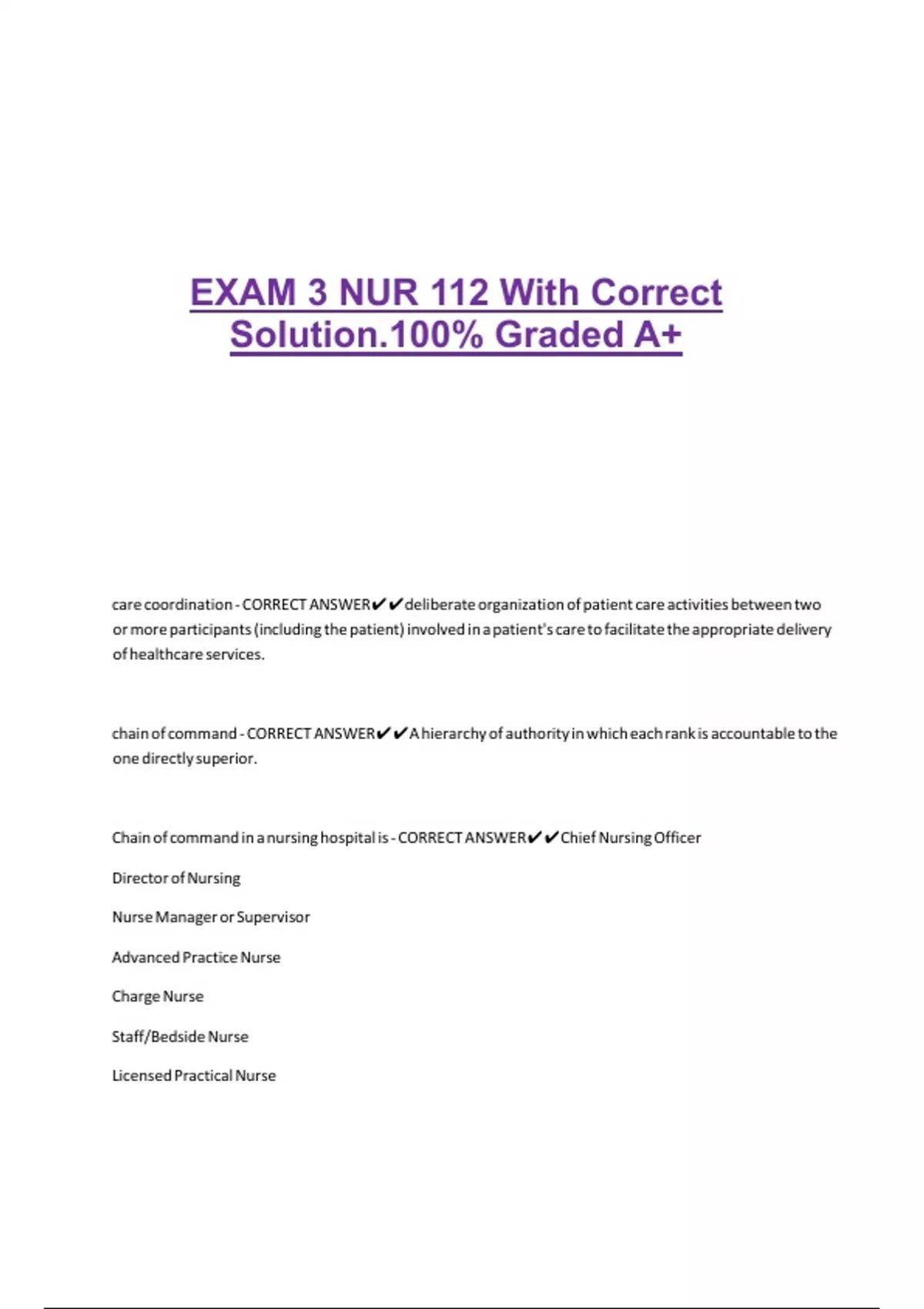Chain of command in a nursing hospital is - CORRECT ANSWER✔✔Chief Nursing Officer
