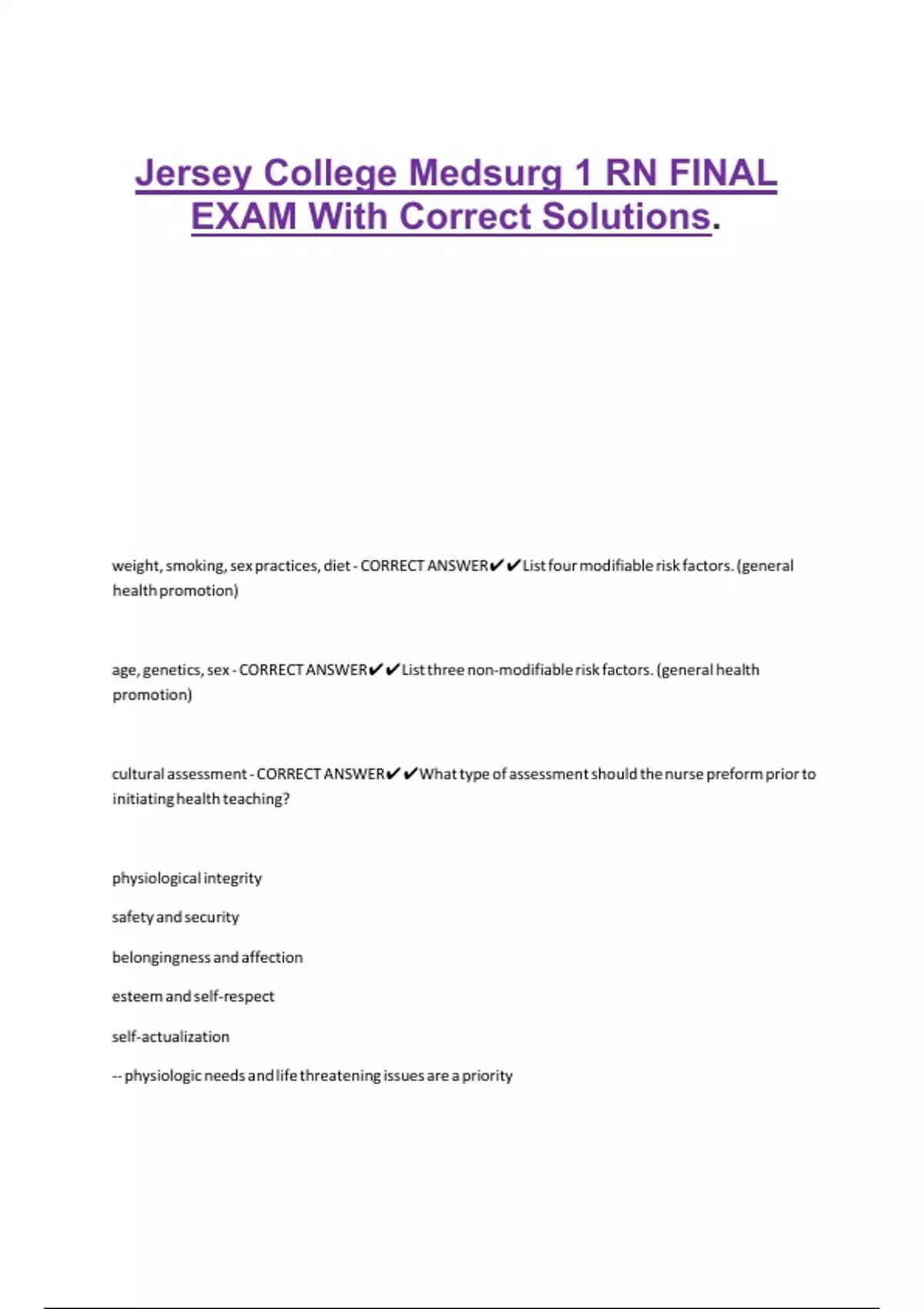 Jersey College Medsurg 1 RN FINAL EXAM With Correct Solutions