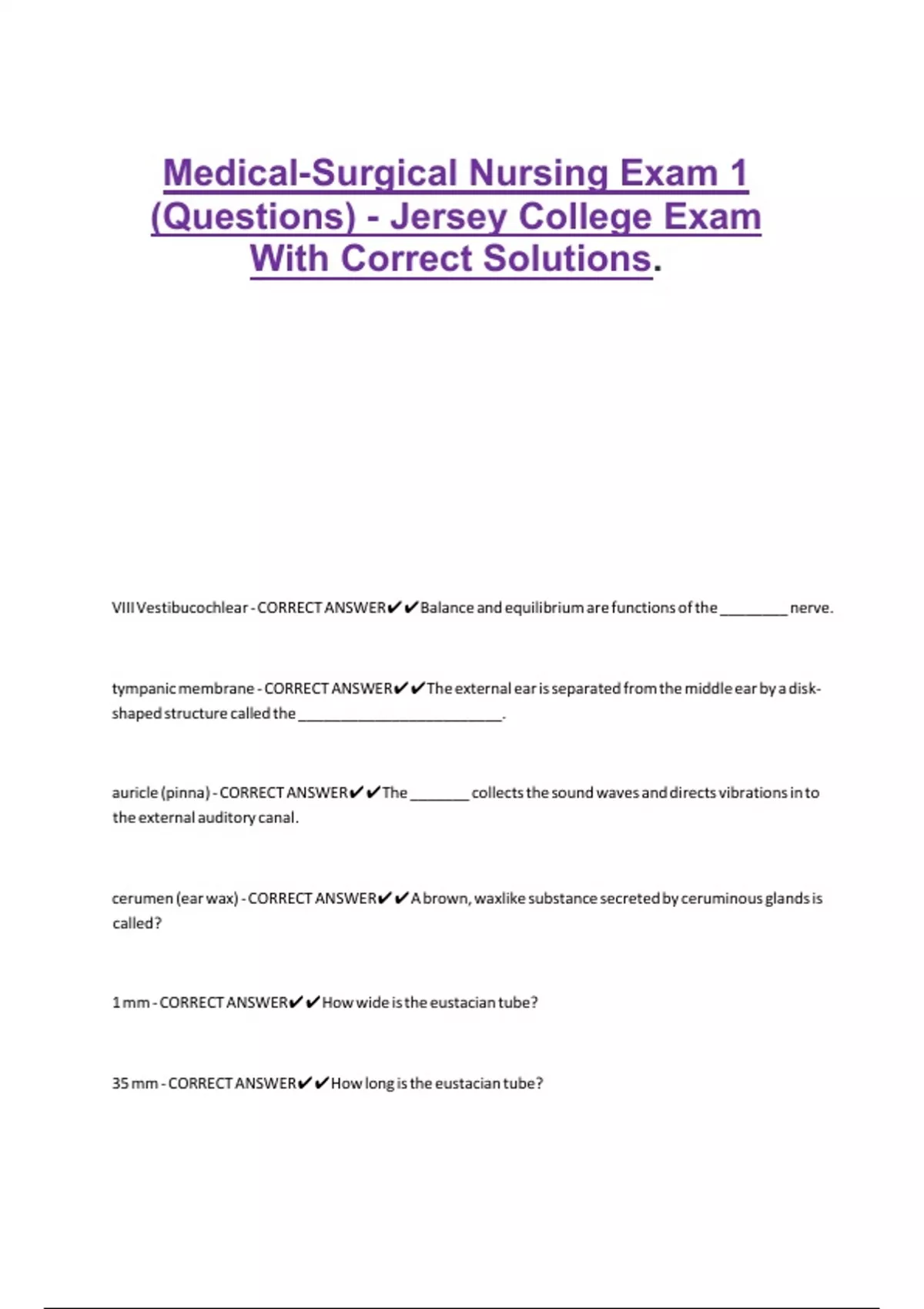 Medical-Surgical Nursing Exam 1 (Questions) - Jersey College Exam With Correct Solutions
