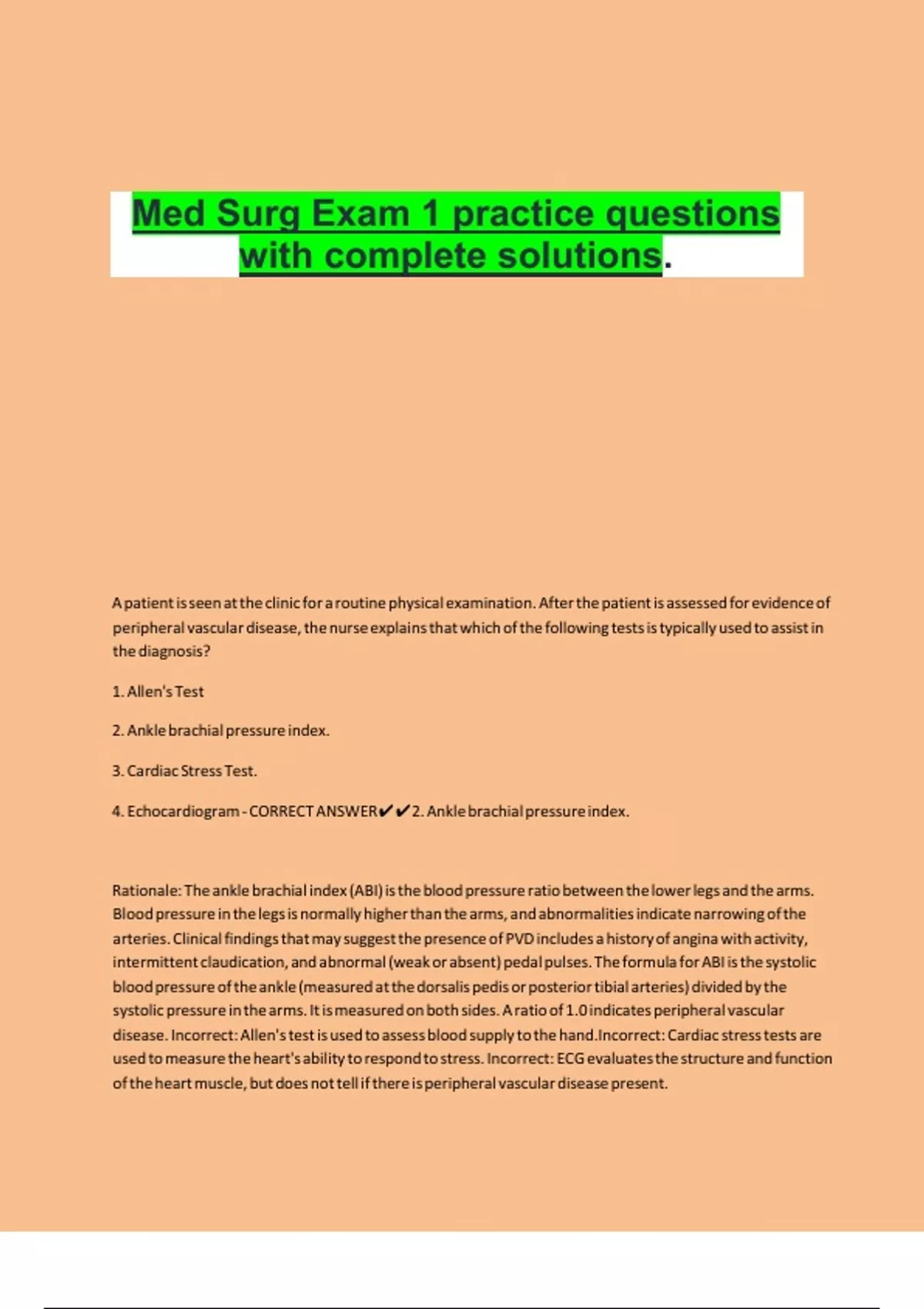 4. Echocardiogram - CORRECT ANSWER✔✔2. Ankle brachial pressure index.