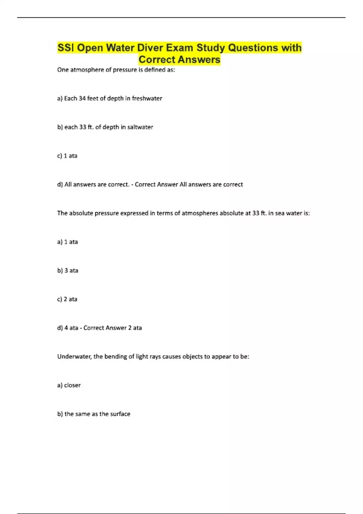 SSI Open Water Diver Exam Study Questions with Correct Answers One atmosphere of pressure is defined as: a) Each 34 feet of depth in freshwater b) each 33 ft. of depth in saltwater c) 1 ata d) All answers are correct. - Correct Answer All answers are correct The absolute pressure expressed in terms of atmospheres absolute at 33 ft. in sea water is: a) 1 ata b) 3 ata c) 2 ata d) 4 ata - Correct Answer 2 ata Underwater, the bending of light rays causes objects to appear to be: a) closer b) the same as the surface