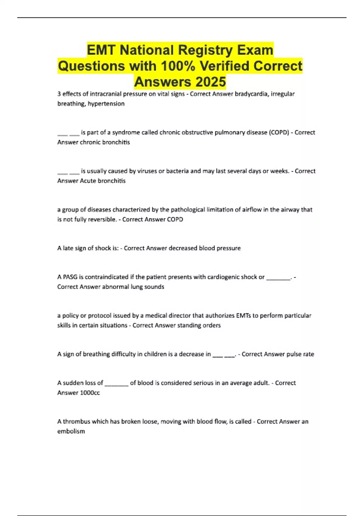 EMT National Registry Exam Questions with 100% Verified Correct Answers 2025 3 effects of intracranial pressure on vital signs - Correct Answer bradycardia, irregular breathing, hypertension ___ ___ is part of a syndrome called chronic obstructive pulmonary disease (COPD) - Correct Answer chronic bronchitis ___ ___ is usually caused by viruses or bacteria and may last several days or weeks. - Correct Answer Acute bronchitis a group of diseases characterized by the pathological limitation of airflow in the airway that is not fully reversible. - Correct Answer COPD A late sign of shock is: - Correct Answer decreased blood pressure A PASG is contraindicated if the patient presents with cardiogenic shock or _______. - Correct Answer abnormal lung sounds a policy or protocol issued by a medical director that authorizes EMTs to perform particular skills in certain situations - Correct Answer standing orders A sign of breathing difficulty in children is a decrease in ___ ___. - Correct Answer pulse rate A sudden loss of _______ of blood is considered serious in an average adult. - Correct Answer 1000cc A thrombus which has broken loose, moving with blood flow, is called - Correct Answer an embolism