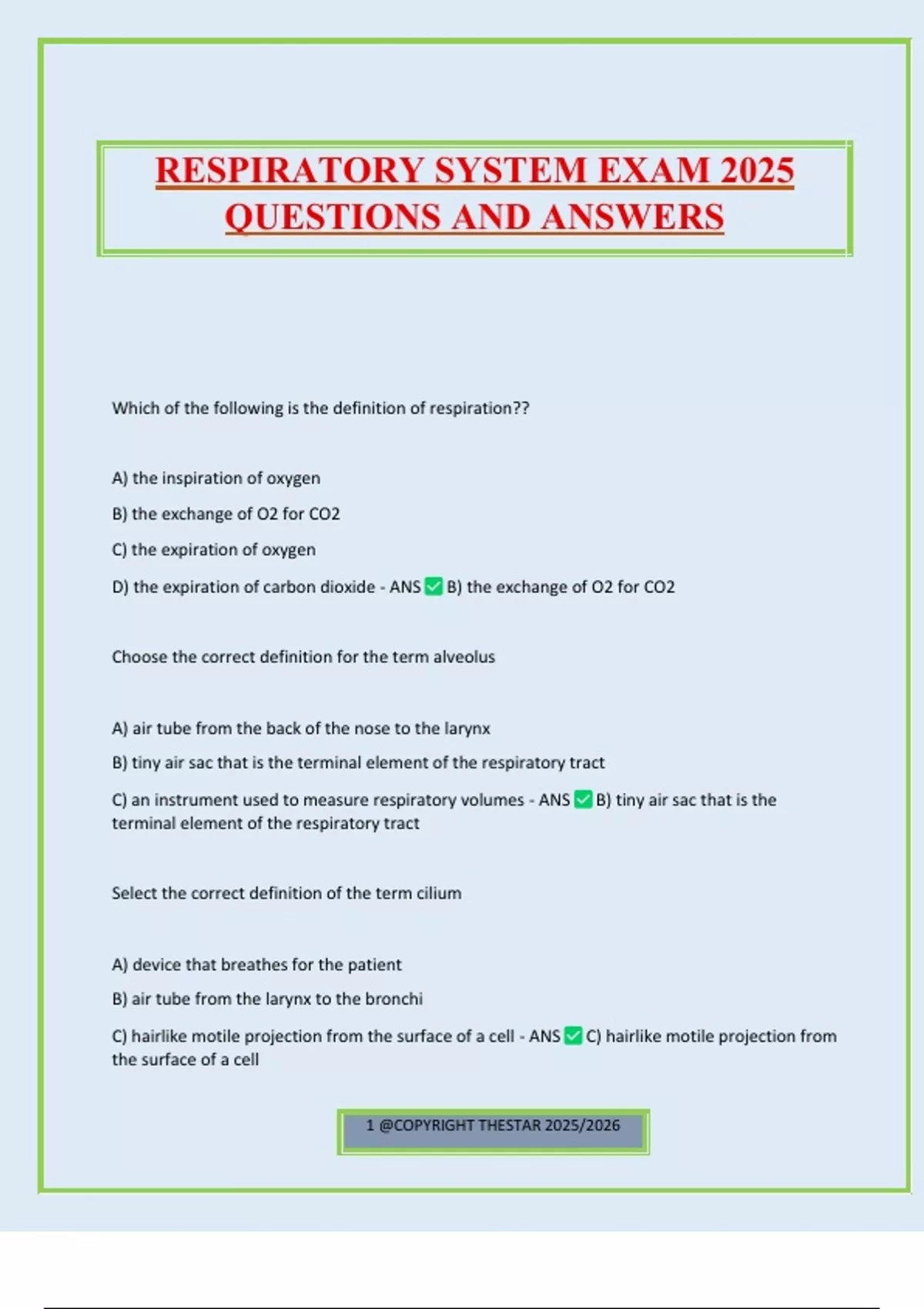 Which of the following is the definition of respiration?? A) the inspiration of oxygen B) the exchange of O2 for CO2 C) the expiration of oxygen D) the expiration of carbon dioxide - ANS B) the exchange of O2 for CO2 Choose the correct definition for the term alveolus A) air tube from the back of the nose to the larynx B) tiny air sac that is the terminal element of the respiratory tract C) an instrument used to measure respiratory volumes - ANS B) tiny air sac that is the terminal element of the respiratory tract Select the correct definition of the term cilium A) device that breathes for the patient B) air tube from the larynx to the bronchi C) hairlike motile projection from the surface of a cell - ANS C) hairlike motile projection from the surface of a cell RESPIRATORY SYSTEM EXAM 2025 QUESTIONS AND ANSWERS 2 @COPYRIGHT THESTAR 2025/2026 Inflammation of the nasal mucosa is known as A) mucositis B) rhinitis C) blepharitis - ANS B) rhinitis Select the correct definition for the term larynx A) Device that breathes for the patient B) sense of smell C) organ of voice production - ANS C) organ of voice production The function of the cilia in the airways is A) voice production B) protection C) smell sensors - ANS B) protection Correct definition of the term respiration A) movement of gases into and out of the lungs B) hairlike motile projection from the surface of a cell C) fundamental process of life used to exchange oxygen and carbon dioxide - ANS C) fundamental proces