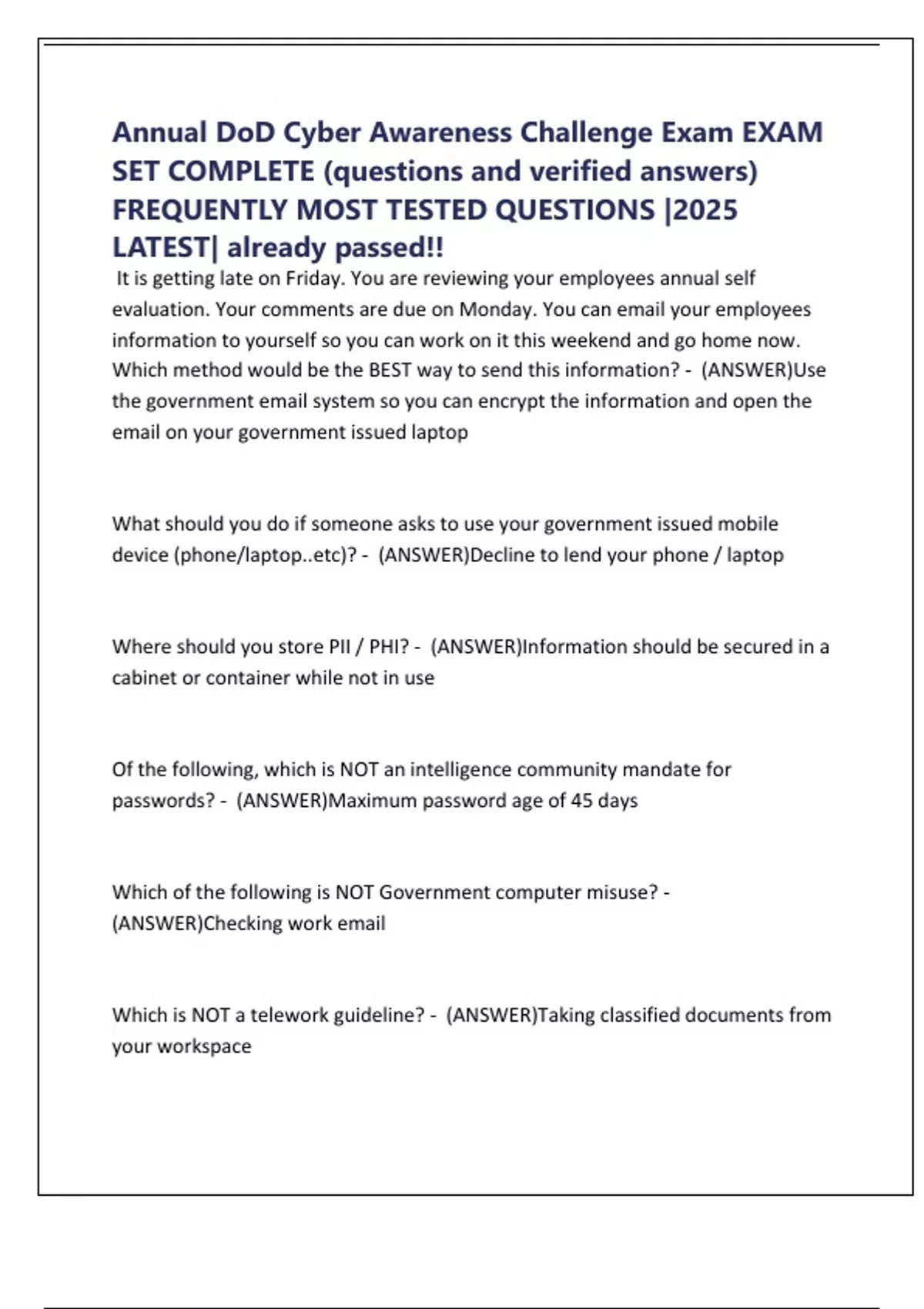 Annual DoD Cyber Awareness Challenge Exam EXAM